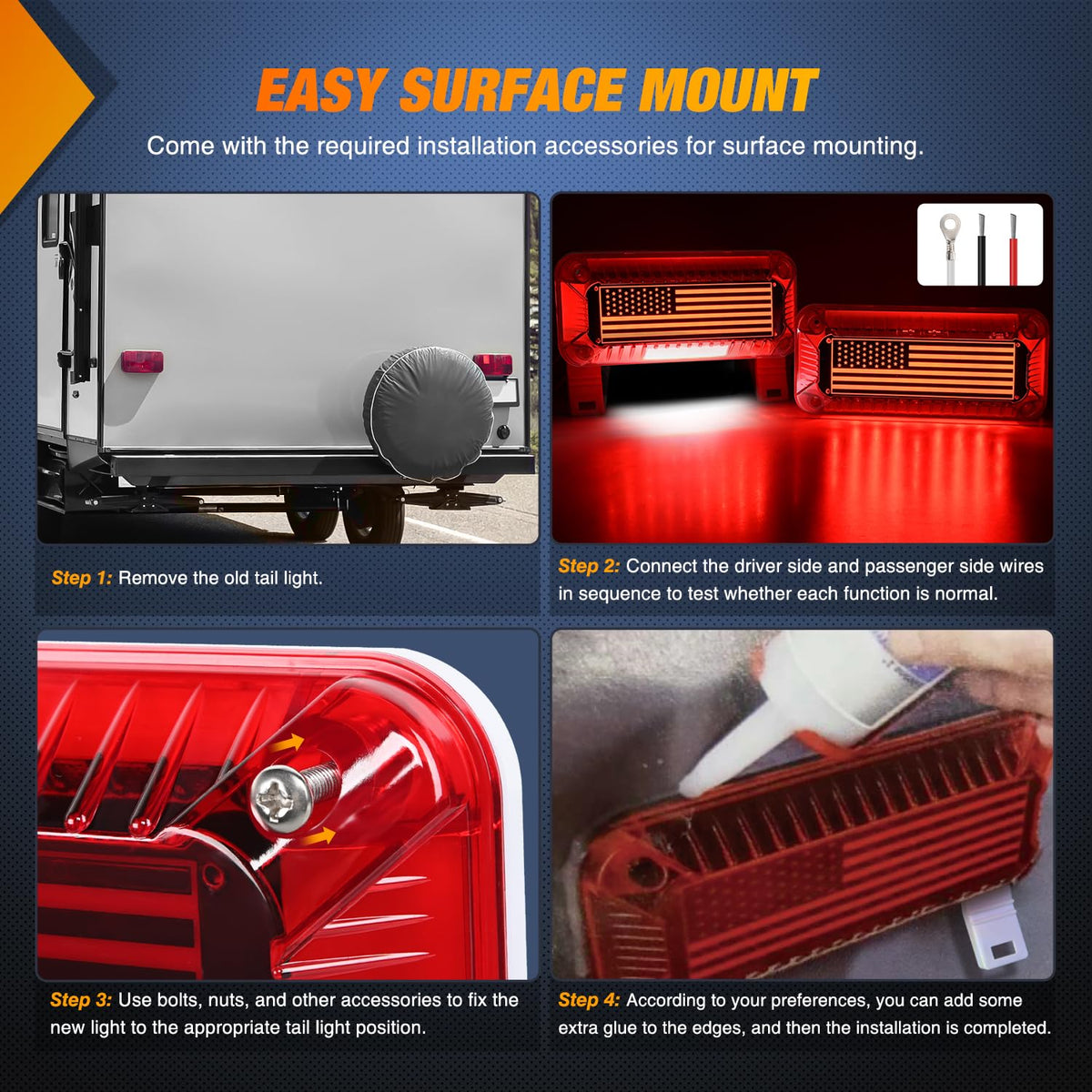 Q: What are the specifications of the Nilight RV Tail Light?A: The Nilight RV Tail Light features 72 LEDs, with 39 LEDs on the driver side (33 red and 6 white for the license plate) and 33 LEDs on the passenger side for red light. It is designed for surface mounting and operates on 12V DC.