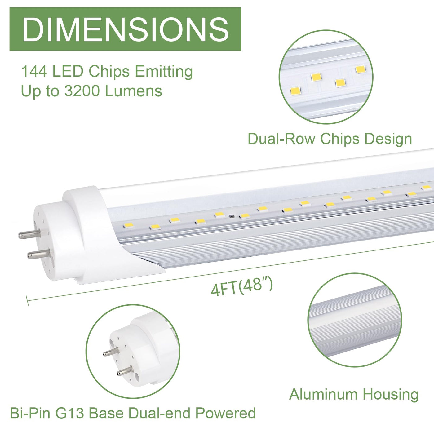 ???5000K Super Bright & Energy Saving?This 4Ft Led Bulbs Adopt With A Double Row Of Led Chips Technology Have A Larger Luminous Surface To Illuminate Your Space With 3200 Lumens Output. Each 4 Foot Led Bulbs Has 24W Low Power Consumption, Saving You 60% On Your Electricity Bill When You Replace Your Old 48W Fluorescent Tube With 24W Led Light Tube, It Is An Excellent Alternative To Traditional T8, T10 And T12 Fluorescent Bulbs, And Are Compatible With Existing T8, T10, And T12 Fixtures. | ???High-Quality & Long Lifespan?4Ft T8 Led Bulbs Uses High Quality Led Chips, No Flickering Or Noise, Which Are More Energy Saving And Environmental Protection (No Uv, Ir, Or Mercury). Aluminum Housing Can Better Dissipate Heat. Better Quality, Safety, Reliability And Have Longer Lifetime Up To 50,000 Hours Than Halogen/Incandescent/Fluorescent Bulbs. Reduce The Frequency Of Led Tube Replacement, Saving Your Money And Time. | ???Remove Ballast Before Installation?Led T8 Bulbs 4Ft Aluminum Light Fixture To Adopt Double-Ends Supplying With Bi-Pin G13 Bases, Simply Plug And Play. Please Remove The Starter And Ballast Before Installing. Refer To The User Manual Installation Guide For Details. Note: Please Install This Item Away From The Radio, Remote Control Door Etc, To Avoid Appearing Current Interference. | ???Wide Application?48 Inch Led Bulbs With A Clear Cover Offers The Best Lighting Experience For Garage And General Area Lighting. Perfect For Lighting Up The Shop, Warehouse, Garage, Workbenches, Mall, Hotel, Office, Convenience Store, Gas Station, Basement, Supermarket, Parking Lot Etc. | ???Friendly Customer Service?We Take High Attention To Product Quality, And Every Item Was Tested Before Packing. Contact Us If You Have Any Questions About The T8 Bulbs 4 Foot, And Our Professional Technical Support Team Will Solve Them For You The First Time.