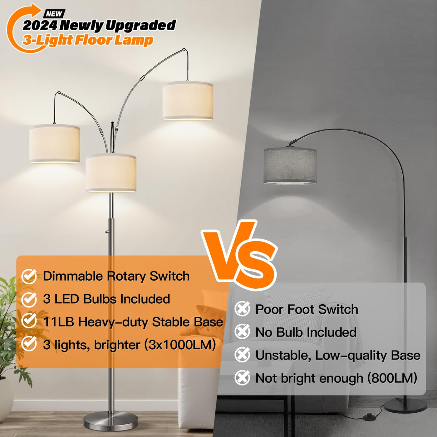 Dimmable Floor Lamp - The standing floor lamp is fully dimmable (0%-100% brightness), which is suitable for all room styles. This tall lamp is very easy to turn on and off. Turn the dimmer switch knob to adjust the brightness. | 3-Lights Elegant Design - The 3 lights hang on the arc branches of the floor lamp for living room, which can increase the lighting range of the living room. The arc branches of the tree lamp can be rotated 360