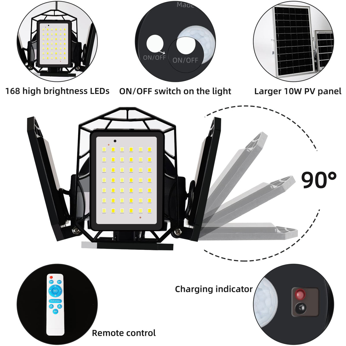 - **Innovative Solar Technology**: Featuring a new version 4-head design with a powerful motion sensor, this solar chandelier harnesses the latest advancements in solar energy to provide exceptional brightness. Each lamp head is equipped with 168 high-quality LED beads, generating up to 1500 lumens to illuminate spaces of 194-237 square feet.