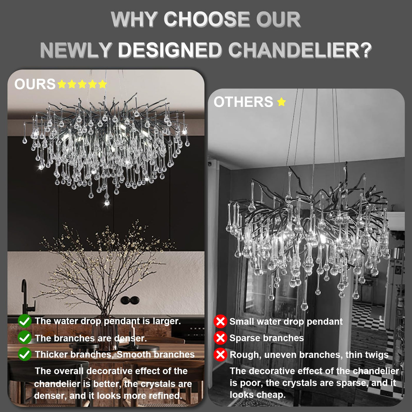 ?Art Deco Chandeliers?The structure and shape of the branch crystal chandelier is unique. Groups of crystals are hung on branch-shaped brackets, giving people a light and elegant feeling.It can not only be used for lighting, but also a beautiful decoration, adding a unique charm to your home space. | ?High-Quality Materials?The dining room chandelier is made of high-quality crystal materials and aluminum alloy. The crystal is crystal clear and can emit soft, warm and non-glaring light. Each branch of the chandelier is removable, the workmanship is exquisite.The number of raindrop pendants is 250. Crystal damage during transportation is inevitable, so we give away an additional 5% of the crystals. If there is a lot of damage, please contact us and we will reissue the crystal to you in time. | ?Funny DIY?This crystal chandelier has a personalized design. You can DIY according to your personal needs, personally participate in the design and assembly process, and feel the fun of DIY. This kitchen chandelier uses thickened ceiling plate and hanging plate, thickened branches, so as to enhance the load-bearing capacity and not easy to fall, so you don