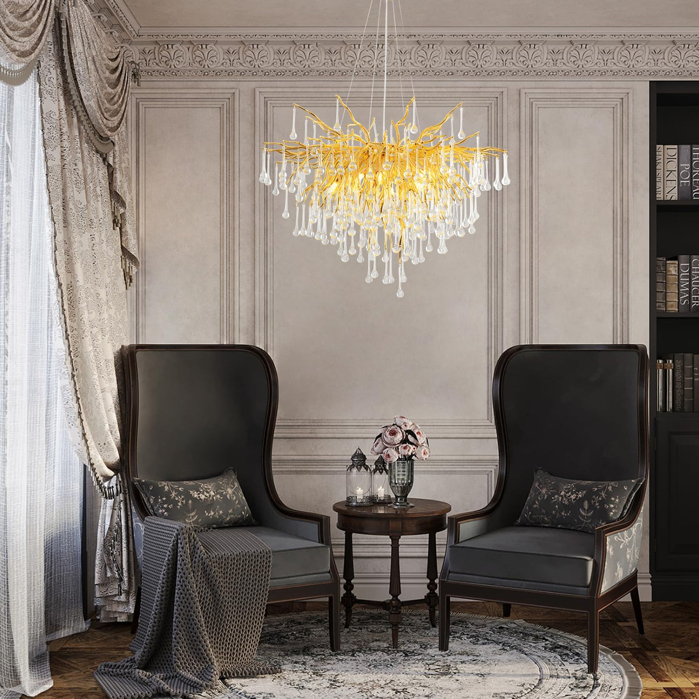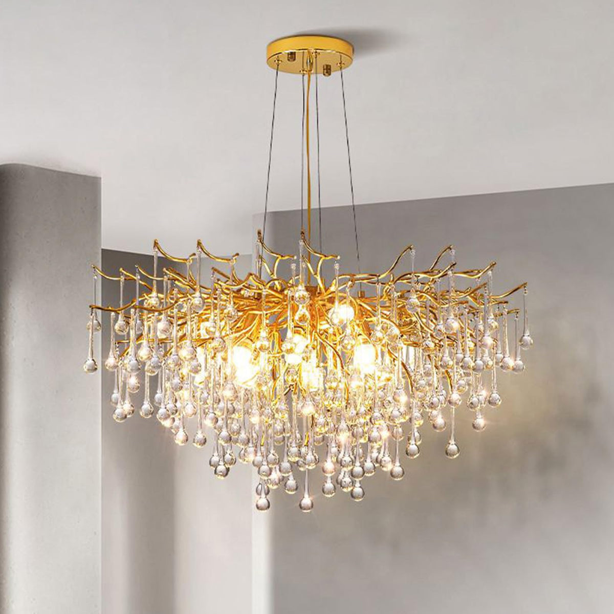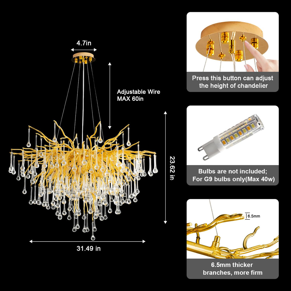 Niuzdu Crystal Chandelier For Dining Room - 31In Modern Farmhouse Crystal Gold Chandelier, Raindrop Tree Branch Chandeliers For