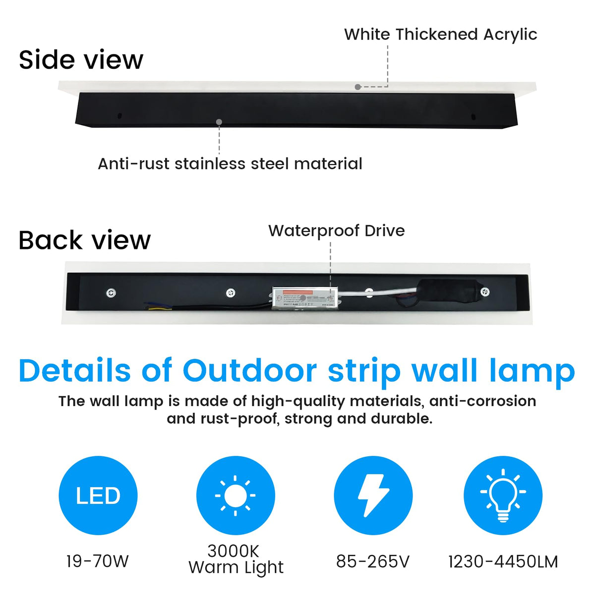 Q: What should I consider before purchasing these outdoor wall lights?A: Before purchasing, please check the size of the lamp (70.8 inches in length and 2 inches in width) and compare it with the specific conditions of your installation location to ensure it fits properly.
