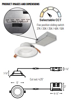 4'' Theia LED luminaires are commercial grade downlights designed for easy installation into new construction or remodel applications. Tunable white luminaires include an integral color temperature switch located on the junction box of each luminaire with a quick connect that allows for easy disconnect and mounting in the ceiling. No housing required Features: Housing is designed for use with remodels or new construction Insulated ceiling rated Constructed from metal Integrated LED lighting Rated for installation in wet locations Dimensions: Height: 1-3/4'' Width: 5'' Depth: 1-3/4'' Trim Size: 4-1/2'' Electrical Specifications: Wattage: 10 watts Number of Light Source(s): 1 Lumens: 950 Color Temperature: 2700K, 3000K, 3500K, 4000K, 5000K Color Rendering Index: 90 CRI
