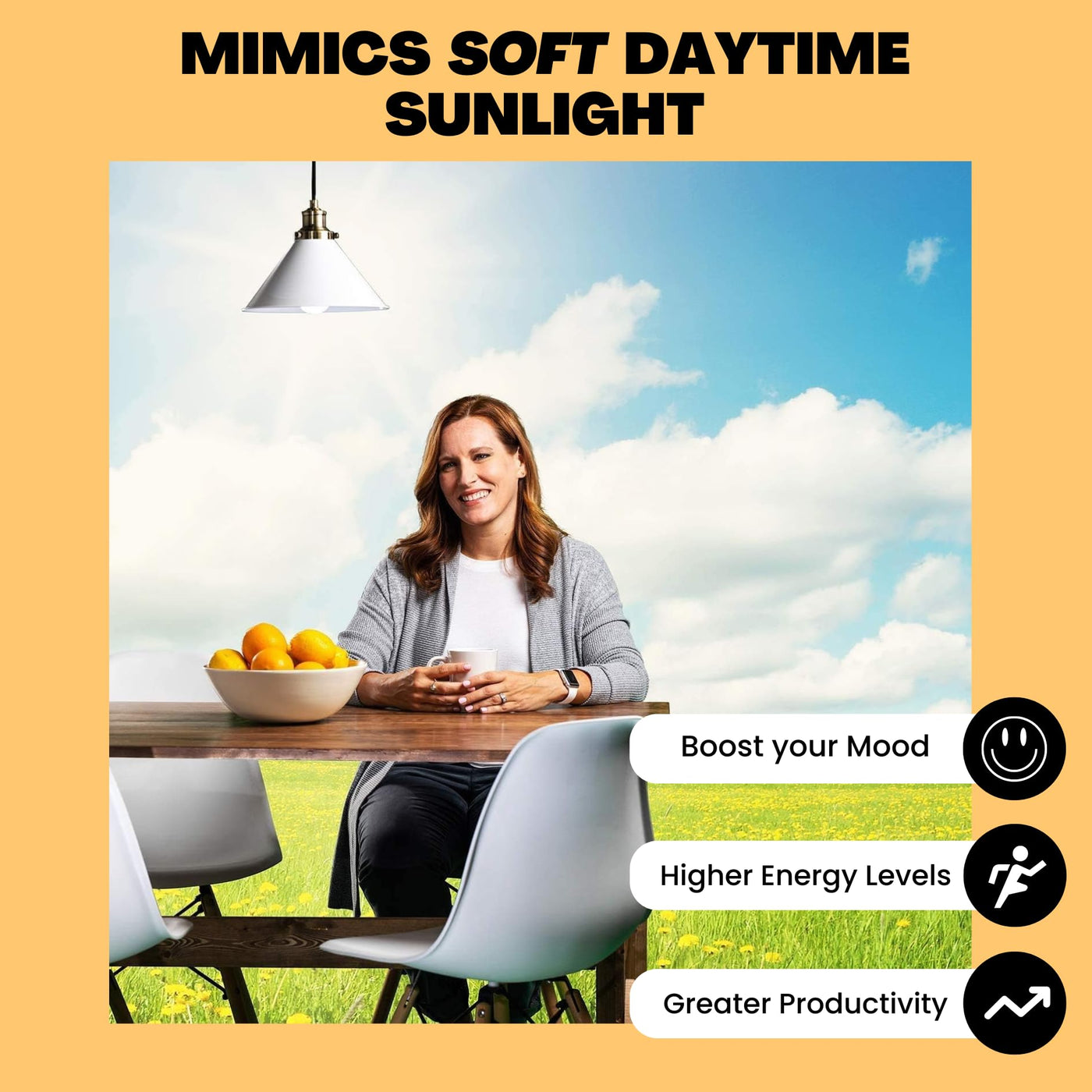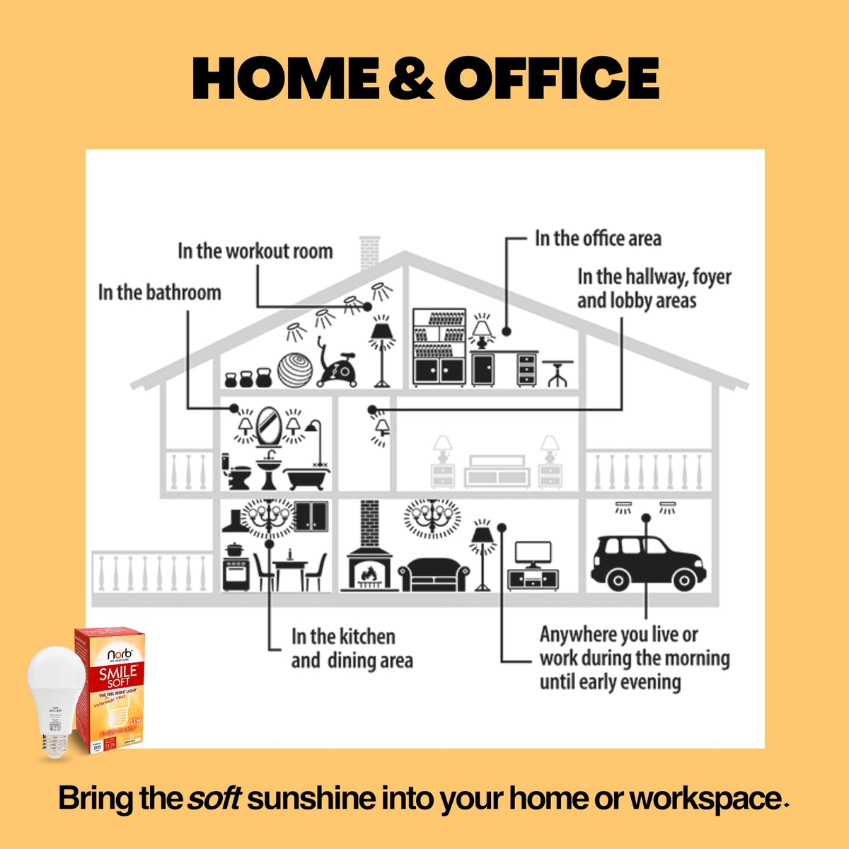 Why Choose Norb Smile Soft 9W Full Spectrum Light Bulb for Better Wellness? NorbSMILE Soft is the warmer-hued version of the NorbSMILE light bulb family, designed to enhance mood, energy, and overall wellness. Featuring a sunlike spectrum, it helps support a healthy sleep/wake cycle, combats fatigue from excessive indoor time, and provides near-perfect color rendering (CRI 97), ensuring objects look natural and vibrant rather than dull or color-distorted. This high-quality, full spectrum LED light bulb delivers bright yet soothing illumination with 11 LED watts, making it an ideal choice for home, office, and wellness spaces. The dimmable design allows for adjustable brightness, and with a 12+ year lifespan (based on 8 hours of daily use) and an estimated annual operating cost of just $1.76, it is a long-lasting, energy-efficient lighting solution. Designed for versatility, NorbSMILE Soft fits standard sockets and is compact enough for most lamps and fixtures. Whether you need a sunlight spectrum LED bulb for a home office, kitchen, bathroom, desk lamp, hallway, or conference room, NorbSMILE Soft provides natural daylight illumination without harmful UV rays. Spending 93% of time indoors under artificial lighting can contribute to sluggishness, low energy, and seasonal blues, especially during winter. NorbSMILE Soft helps support hormone regulation for improved mood, focus, and well-being by providing a light spectrum similar to sunshine. Elevate your indoor lighting and experience the benefits of natural light year-round with NorbSMILE Soft. Order today for a brighter, healthier home.