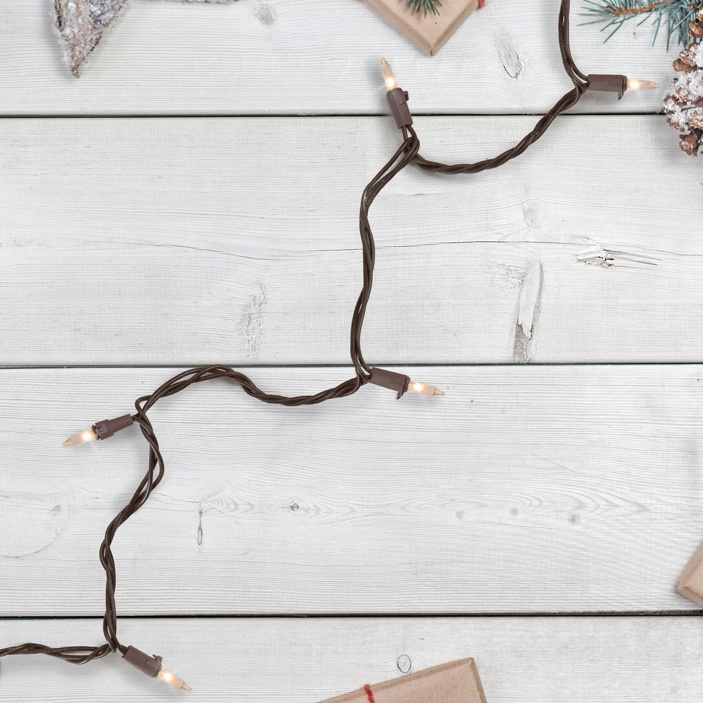 Clear mini Christmas string lights with a brown wire.