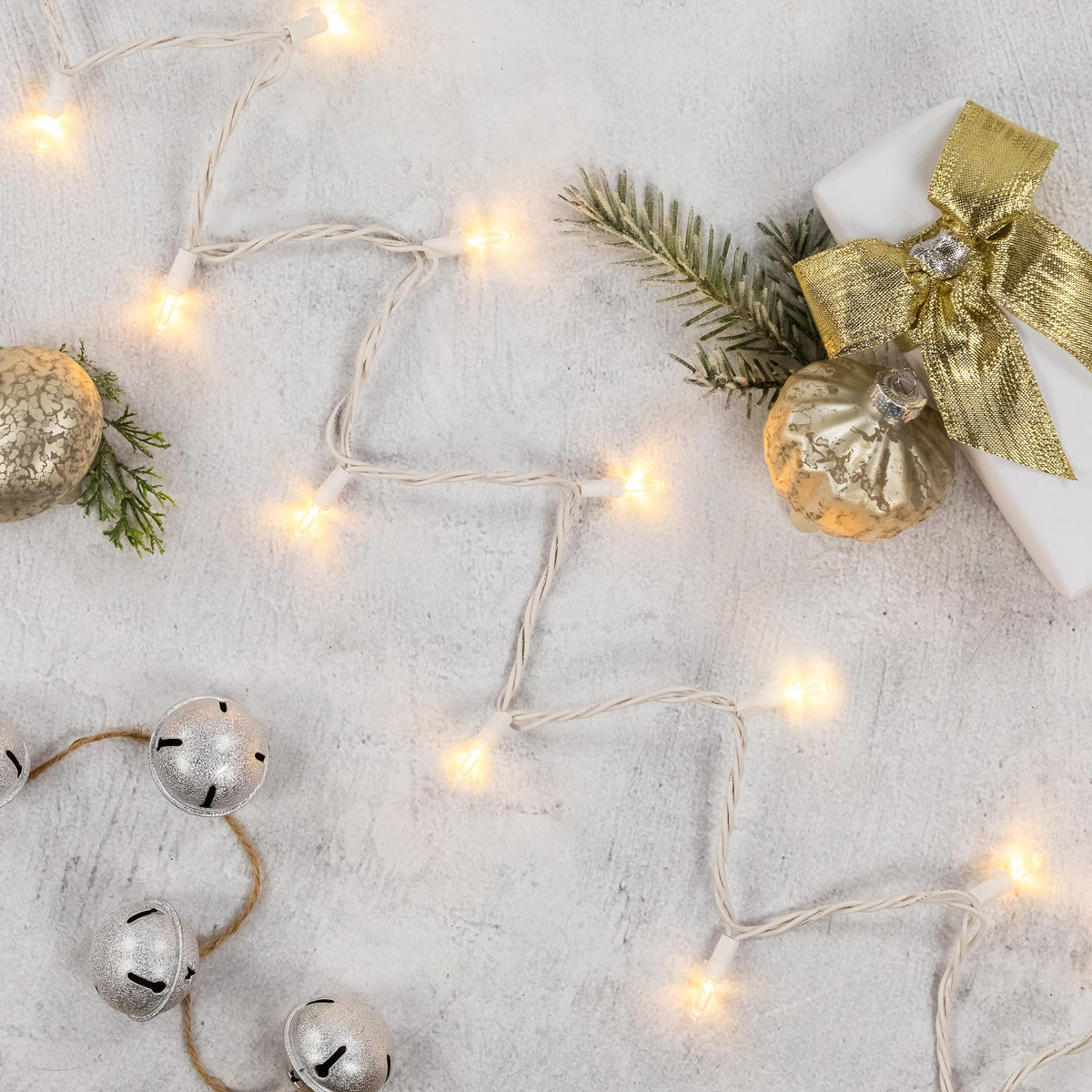 These energy-efficient LED lights will add a warm and cozy glow to your Christmas tree, wreath, or any other indoor space. The 35ct Warm White LED Mini Christmas Lights are built to last with durable construction and high-quality materials. The white wire blends seamlessly with any d cor, making it a versatile option for any style of home. The warm white LED lights emit a soft, inviting glow that will create a cozy atmosphere in your living space. Product Features:. Color: warm white bulbs / white wire. ''Warm clear'' also known as ''warm white'' has a soft incandescent glow similar to candlelight. Number of bulbs on string: 35. Bulb size: mini. Spacing between each bulb: 4''. Lighted length: 11.25'. Total length: 12.5'. 12'' lead cord. 3'' tail cord Additional Product Features:. LED lights use 90% less energy. Durable non-glass replaceable bulbs. Cool to the touch. UL certified and approved for indoor or outdoor use. If one bulb burns out, the rest will stay lit. Lights are equipped with lamp lock, which makes them replaceable, interchangeable and keep them from falling out. Comes with replacement bulbs and spare fuses. Contains end to end connectors which allow you to connect multiple sets together (not to exceed 210 watts). Wire gauge: 22. 120 volts, 60 hertz, .02 amps, 2.4 watts Material(s): plastic