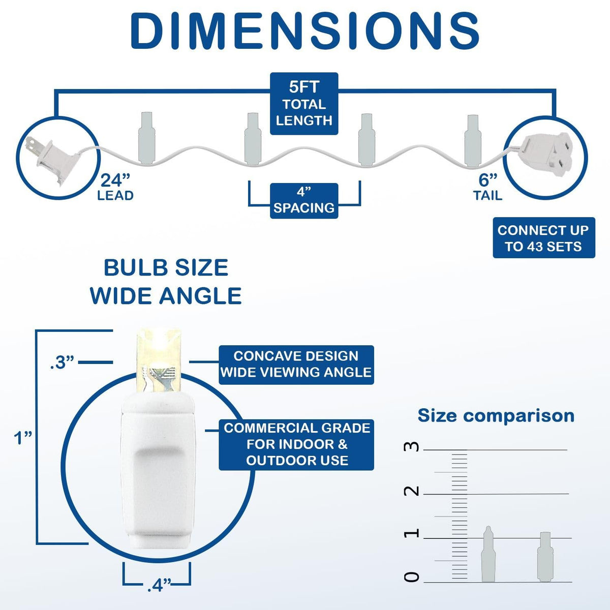 This mini light set features 10 ultra-bright 5MM wide angle concave bulbs mounted on durable white wire. Each string is 6.5 feet long and includes a 6-inch lead wire from the plug to the first bulb, allowing for easy setup in various spaces. The lights are designed to be connectable end to end, enabling you to combine up to 43 sets for a total length of 279.5 feet, making them ideal for larger displays.