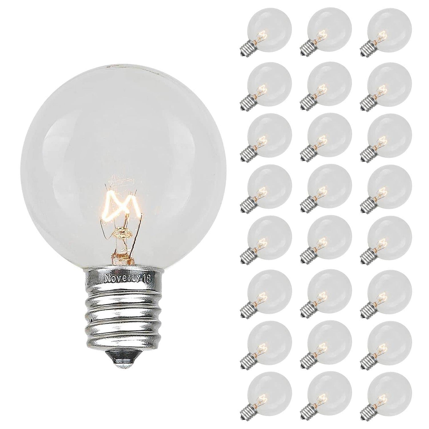 25 Pack Of G50Clear 7 Watt Bulbs Screws Into C9 Socket/ Intermediate Base Long Life 3000 Hour Bulbs 130 Volt 7 Watt Size: 2-7/8''High X 2'' Wide Nickel Plated E-17 Base