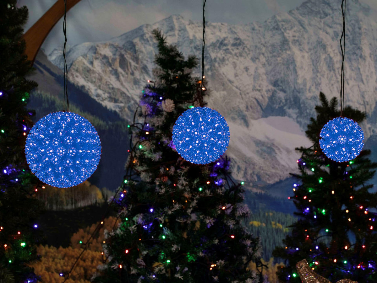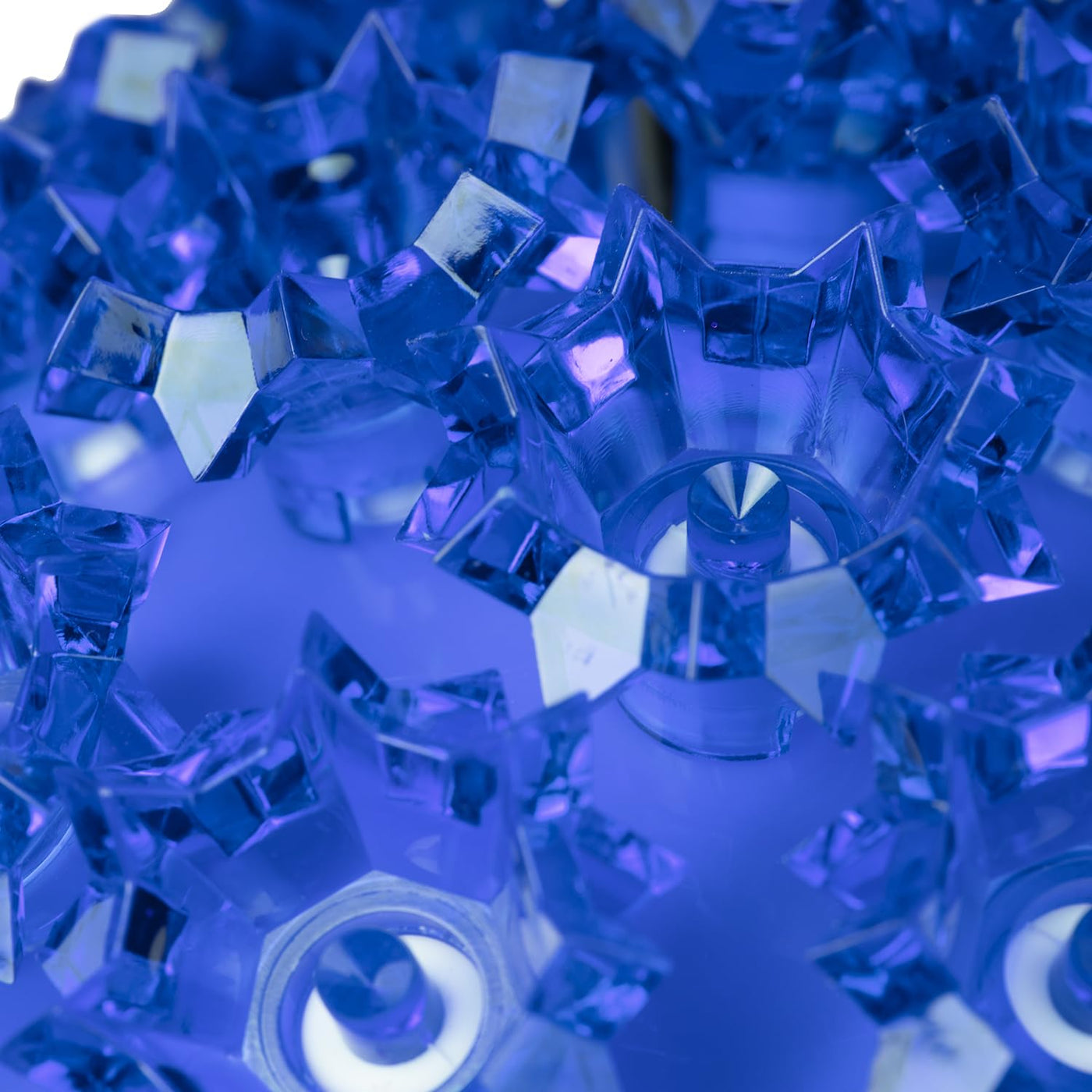 The Blue Starlight Sphere lights feature a durable construction with 150 super bright 5mm wide-angle LED bulbs, providing 360-degree illumination. Each bulb is surrounded by a plastic incrystalin or instarburstin that enhances the light dispersion, casting a brilliant glow in every direction. Built to withstand the elements, these lights feature a riveted seam for superior protection, making them suitable for both indoor and outdoor use. With a lifespan of up to 40,000 hours, these lights are a reliable choice for decorators and homeowners alike. The unique concave design of the bulbs ensures maximum brightness and visibility without flickering, allowing for an impressive lighting display.