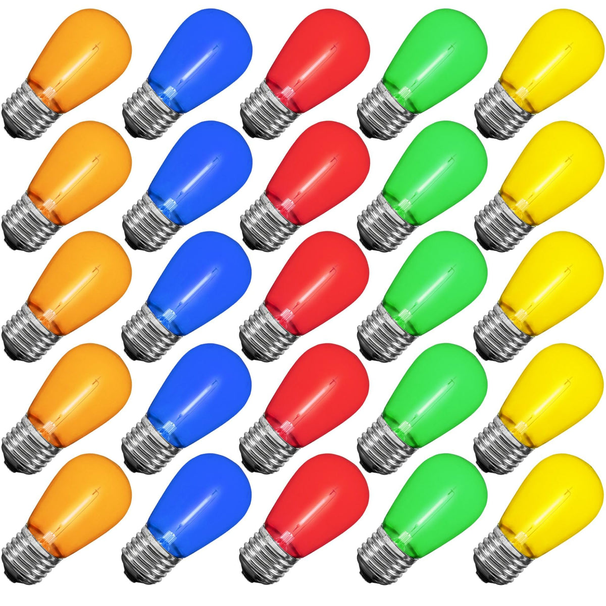 Q: What colors do the Novelty Lights bulbs come in?A: The Novelty Lights bulbs offer a multicolor glow, including green, blue, red, yellow, and orange, allowing you to create a vibrant ambiance for any event.