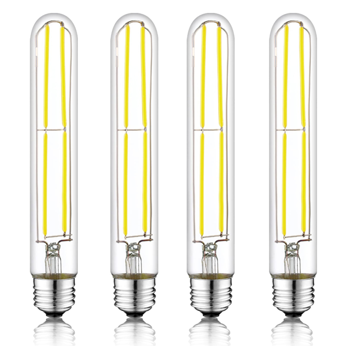 Incandescent Light Quality Designed to replicate incandescent light, while giving true 360 degree light output.Equivalent to a 80W incandescent bulbUses LED filament technology to give it a rated 30,000 hour lifeOur LED filament bulbs turn on instantly to full brightness with no delay.UL certification is the necessary approval for the products safety.SavingsOur 6W LED filament bulb consumes 90% less energy than a 80W incandescent, while giving the same amount of light.GreenLessen the impact on our environment and reduce landfill waste.Mercury free, making them much safer around kids and pets than those curly CFL bulbs.Our package was used with the kraft paper, which is environment protecting.Made Better We use thicker LED filaments in our bulbs to give better quality and brighter light.The bulbs glass will feel warm but stay cooler than normal LED bulbs, incandescent bulbs, or CFL bulbs which can be very hot when you touch it.Solid glass, aluminium, and plastic construction ensures a durable bulb at a fraction the weight of normal LED bulbs with their metal cooling blocks. Specification:Product Dimensions: 1.18 x 7.28in / 30mm x 185mm Type of Bulb: LEDLuminous Flux: 800 lmWattage: 6 watts Voltage: 120V Ra: 85+Beam angle: 360 Bulb Features: Dimmable Color Temperature: 5000 KelvinPackage Content: 4 x T10 6W LED bulb 4 x package