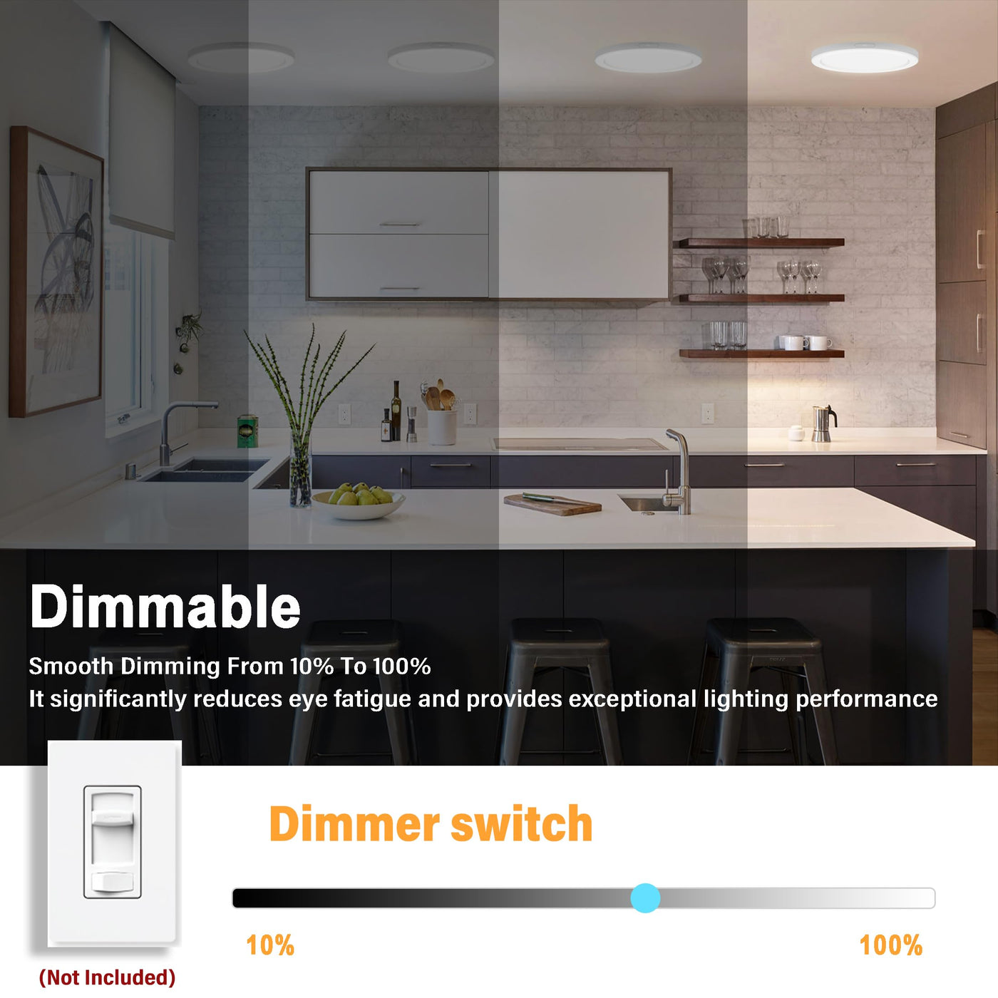 This ceiling light is crafted from well-made aluminum, ensuring durability and a modern aesthetic. With a flat, slim profile of only 0.8 inches thick, it fits seamlessly against the ceiling, offering an unobtrusive lighting option. The lights dimmable functionality, compatible with most dimmers, allows users to adjust the brightness to suit their preference, making it perfect for any occasion.