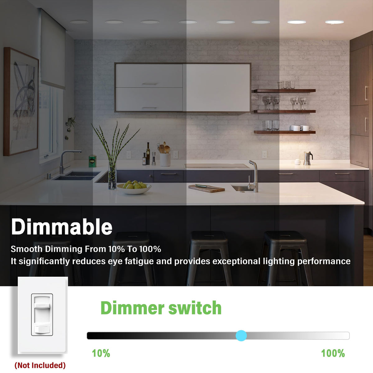 Dimmable functionality (10%-100%) compatible with most dimmers.