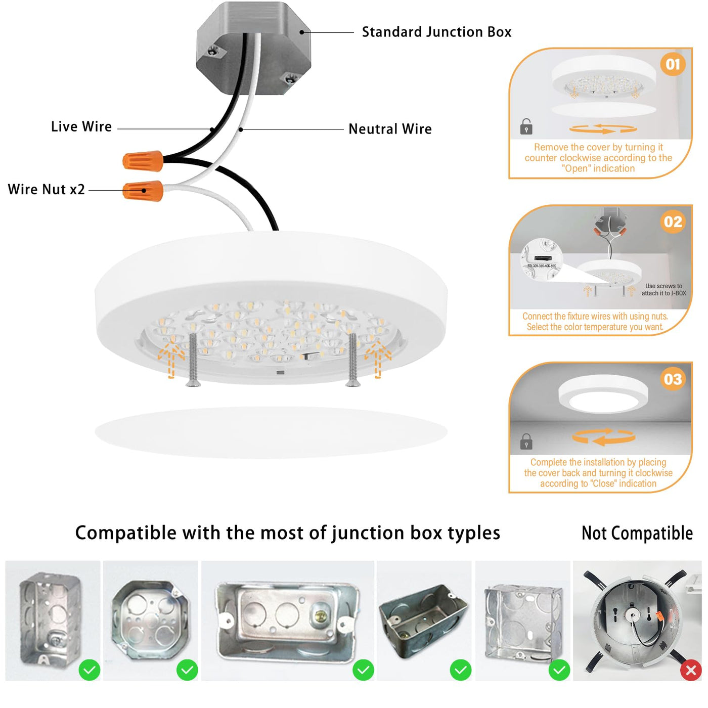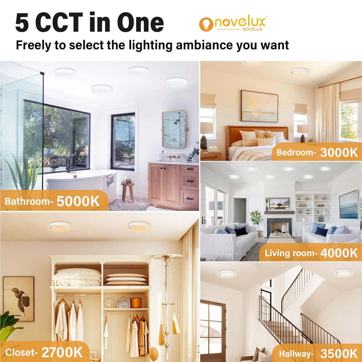 Q: How easy is it to install the NOVELUX flush mount ceiling light?A: The installation of the NOVELUX 5CCT 7 inch ceiling light is quick and straightforward. It is hardwired and requires no assembly. You can install it in just a few minutes following the provided installation guide, and it fits most junction boxes.
