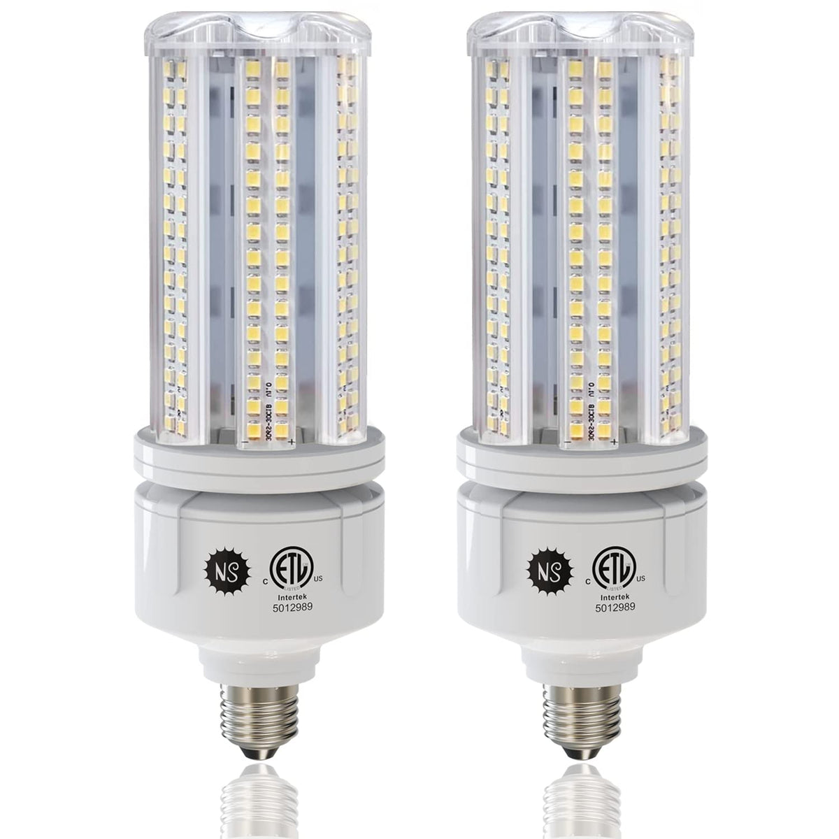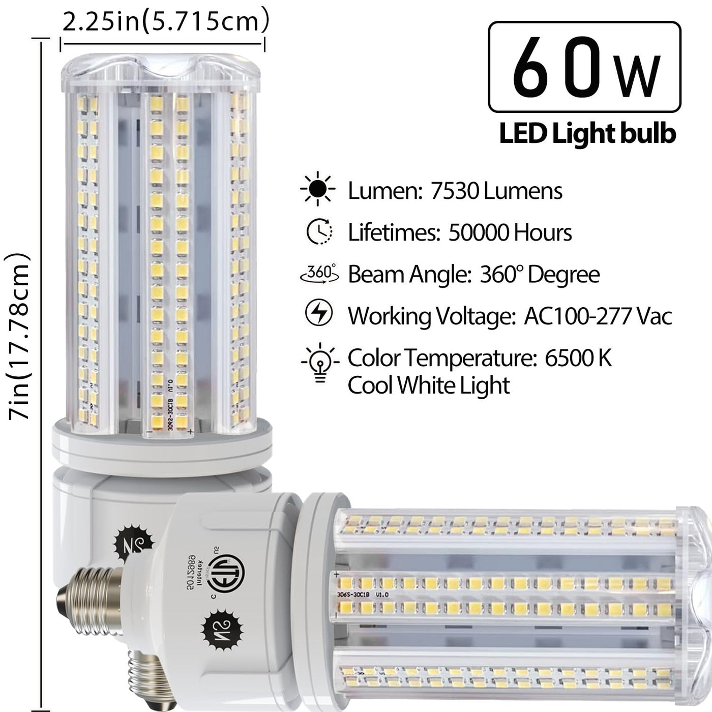 Description ?The LED corn bulbs are a great alternative that save energy and lower utility costs.Designed to replace CFL,metal halide and high-pressure sodium lamps ?LED corn lights also last longer than traditional HID lamps, so you save money on replacement costs and maintenance ?These LED corn bulbs are ideal for applications including enclosed pole top, and typical HID fixtures ?Suitable for indoor outdoor lighting, kitchen, basement, living room, garage, garden, backyard, workshop, warehouse, shop, factory, parking lot, stadium, gym, backyard, barn, porch, supermarket Specification Wattage: 60W Input Voltage: 110-277V, 60Hz Lumen: 7530Lm Lamp Base: E26 Medium Base Color Temperature: 6500K Beads Type: SMD 2835 Color Rendition Index: >80 Dimension: F2.25*2.25*7 inches In Item Weight: 0.64 Lb LED Average Life: More than 50,000 hours Safety Certification: CE, UL, DLC Replacement Guide 20W LED light = 75W HPS/HID/MH light = 300W incandescent light 30W LED light = 100W HPS/HID/MH light = 500W incandescent light Package Include 2 X 60W LED Light Bulb Note: Please remove or passby original ballast, capacitor or starter, when replace the HID/HPS/MH