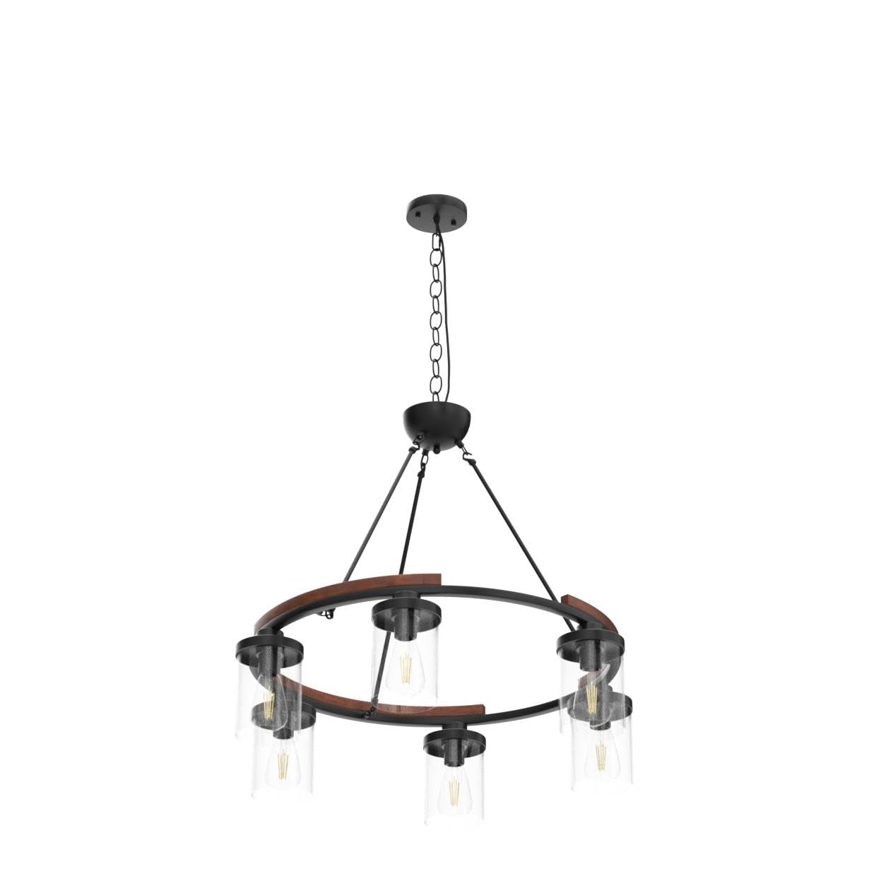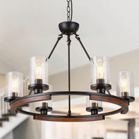 - **Farmhouse Style**: Embrace the allure of farmhouse decor with this beautifully crafted chandelier featuring a striking black metal frame, warm wood accents, and clear glass shades. Its versatile design allows for customizable installation, enabling you to orient the circular body either up or down to suit your space.