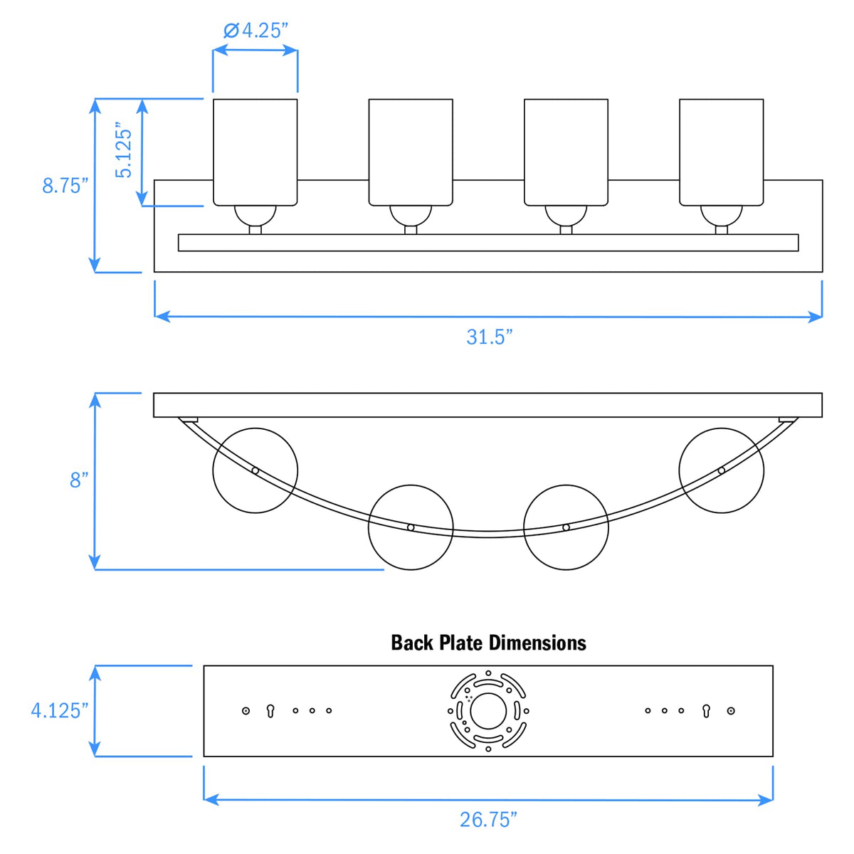 Q: What are the dimensions of the Nuk3y vanity light fixture?A: The fixture measures 31.5 inches in width, 4.375 inches in height, and 0.75 inches in depth for the base, while the overall size with the glass shade is 31.5 inches wide, 8.75 inches high, and 8 inches deep.