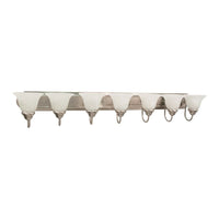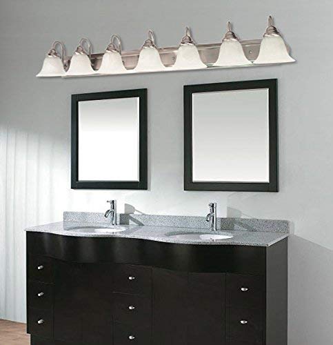 Amazon.comAdd a traditional touch to your bathroom or vanity with this seven-light Ballerina vanity, which features a brushed nickel finish and curvy alabaster glass shades. This dimmable fixture uses seven A19 medium base incandescent bulbs (100-watt maximum; not included), and it measures 48 inches wide by 7-2/3 inches high with an 8-1/2-inch extension. The arms on this Nuvo Lighting vanity fixture features steel reinforcement bars to support the arms and prevent flexing of the backplate. It can be used in damp settings, and the fixture can be used either up or down. The traditionally styled Ballerina vanity (view larger). Tips for Lighting Your Bath or VanityWhen choosing lighting for a bathroom, keep in mind that you don't need as much light with such a small area, and a single light over a mirror can cast shadows in a small space.Tip: In addition to a single light over a mirror, consider using a close-to-ceiling fixture for overhead lighting. The down light from this fixture will help eliminate shadows on the face.Tip: Consider using two single wall fixtures on the sides of a small mirror. This will help eliminate shadows while balancing the light distribution evenly in the room. About Nuvo LightingNuvo Lighting is a division of Satco Lighting, a premier supplier of a variety of lighting products since 1966. With the companys keen understanding of the lighting business and emerging trends in energy conservation, Satco established its Nuvo Lighting brand in 2005 with energy efficiency as the cornerstone. Satco and Nuvo have been at the forefront of energy efficiency through numerous programs and initiatives to educate and inform the industry as well as the public about energy efficient lighting and how to integrate it into their homes and businesses. 60-291 Ballerina Seven-Light Vanity At a Glance Brushed nickel finish with alabaster glass shades Measures 48 x 7-2/3 inches with 8-1/2-inch extension Uses seven 100-watt A19 medium base incandescent bulbs Bulbs not included 1-year limited warrantyProduct DescriptionNovo Lighting 60/291 Traditional Seven Light Vanity from Ballerina collection in PW, Nickle, B/S, Slur. finish, Height: 7.63 inches Width: 48.00 inches Style: Traditional Light Type: Vanity & Wall Safety Rating: callus and Safety Listing: Damp Number of Lights: 7, Bulb Type: A19, Bulb(s) Included: No