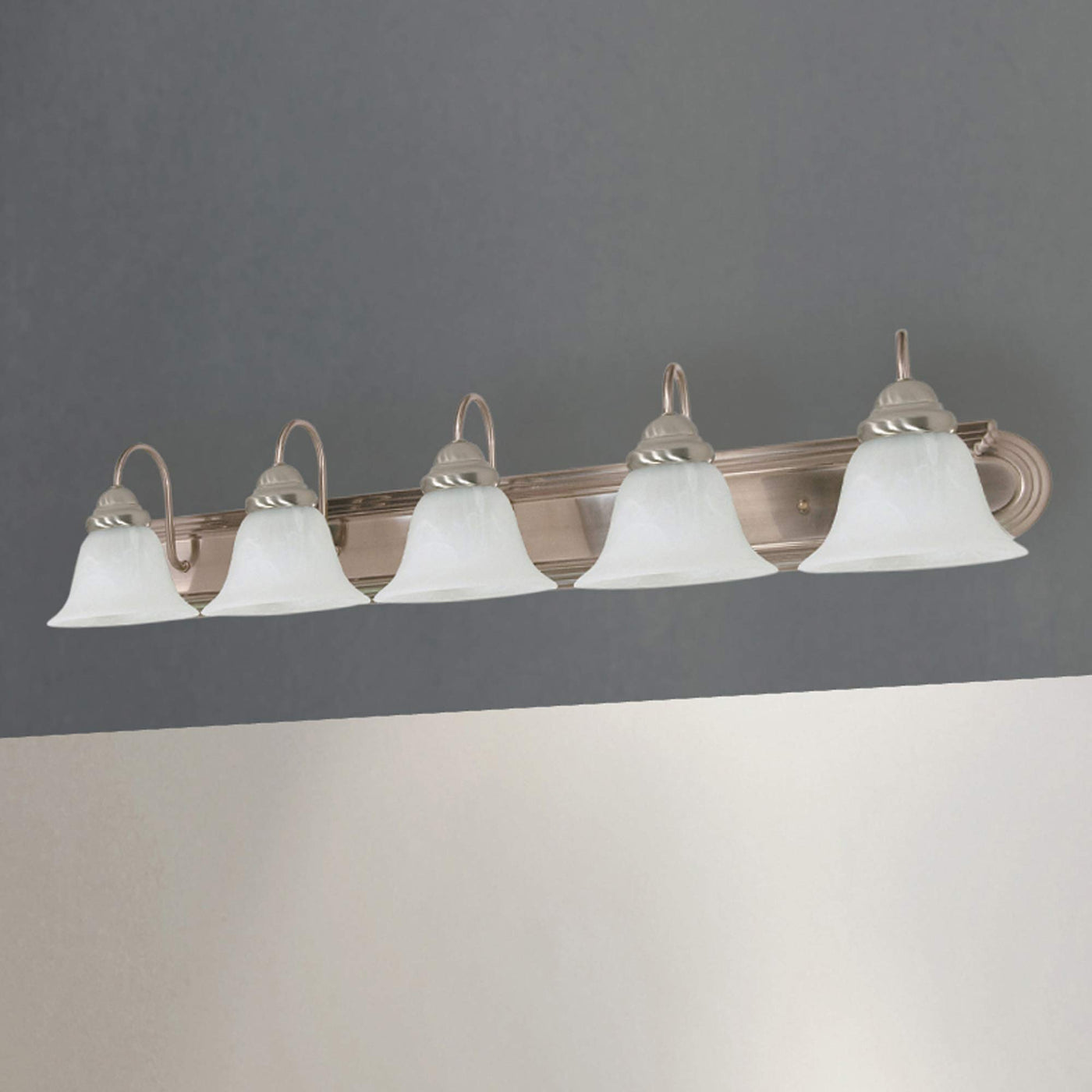 Product DescriptionNovo Lighting 60/323 Traditional Five Light Vanity from Ballerina collection in PW, Nickle, B/S, Slur. finish, Height: 7.63 inches Width: 36.00 inches Style: Traditional Light Type: Vanity & Wall Safety Rating: callus and Safety Listing: Damp Number of Lights: 5, Bulb Type: A19, Bulb(s) Included: NoFrom the ManufacturerBrushed nickel ballerina five light 36-Inch vanity with alabaster glass. (5) 100-Watt A19 medium base bulbs not included.