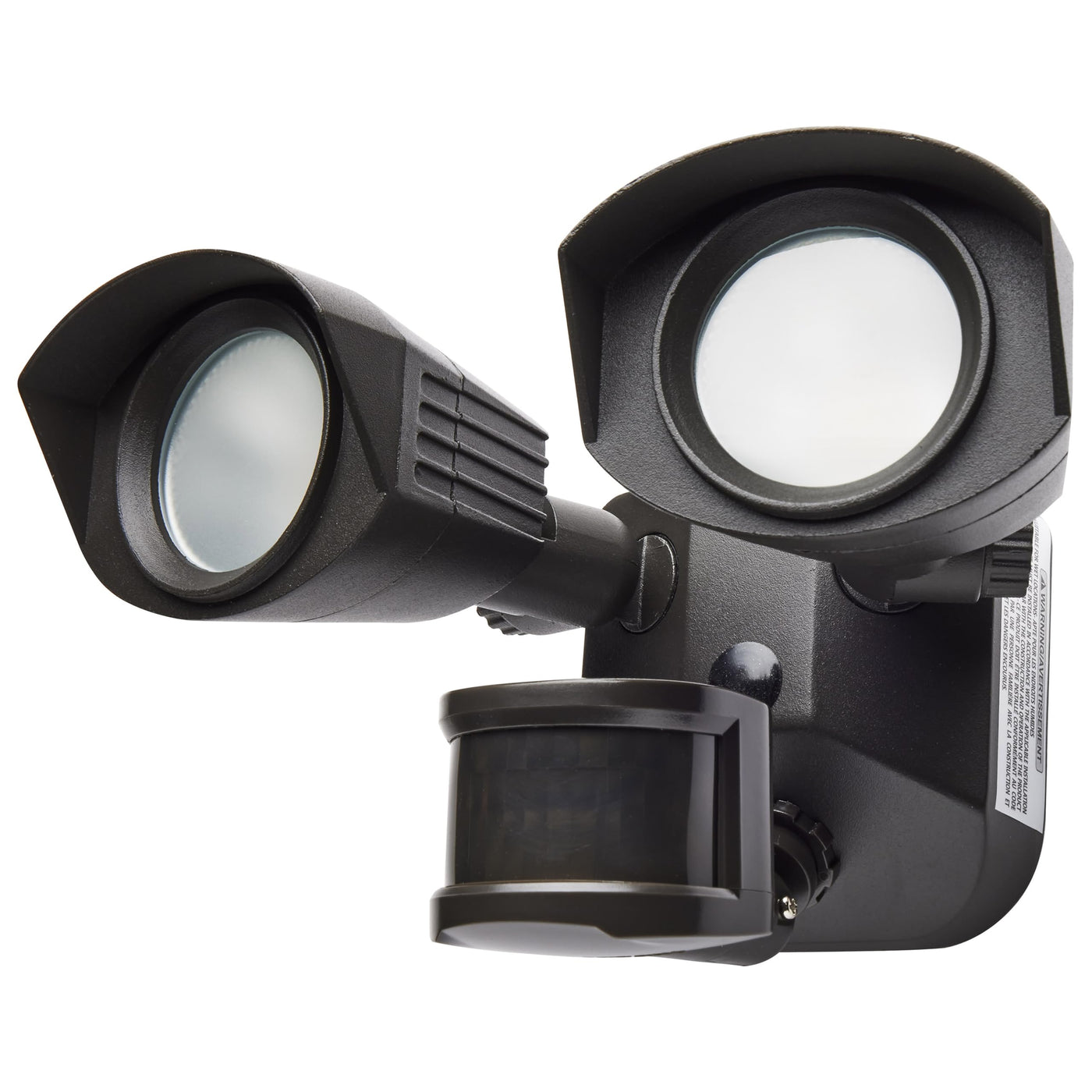 LED Dual head security light, with or without motion sensor. Features • Ideal for walkway, patio and entrance lighting • Die-cast aluminum body and heads • Impact resistant lenses • White, Black or Bronze finish • UV Stabilized powder coated finish • Wall mount—recessed junction box required • 2KV Surge protection • Suitable for wet locations • 100-277V (without motion sensor) • 120V (with motion sensor) • >80 CRI • Operating temperature -30°C to 50°C • 50,0000 Hour life • ENERGY STAR certified • 5 Year warranty