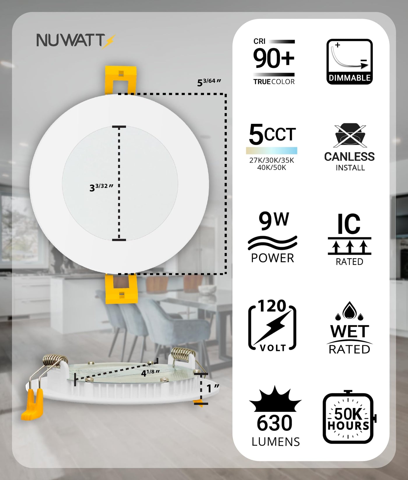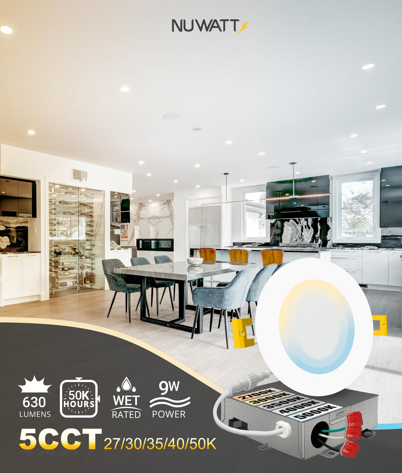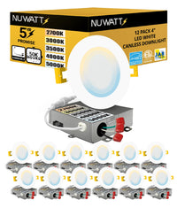 Nuwatt 12 Pack, 4 Inch Ultra-Thin Led Recessed Lighting, 5Cct 2700K/3000K/3500K/4000K/5000K Selectable, 630Lm, 9W, Ic Rated, Dim