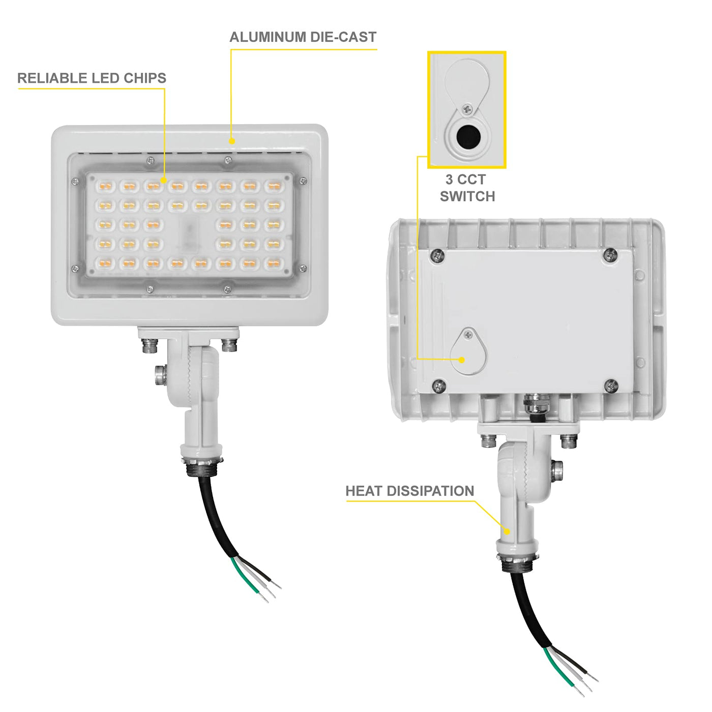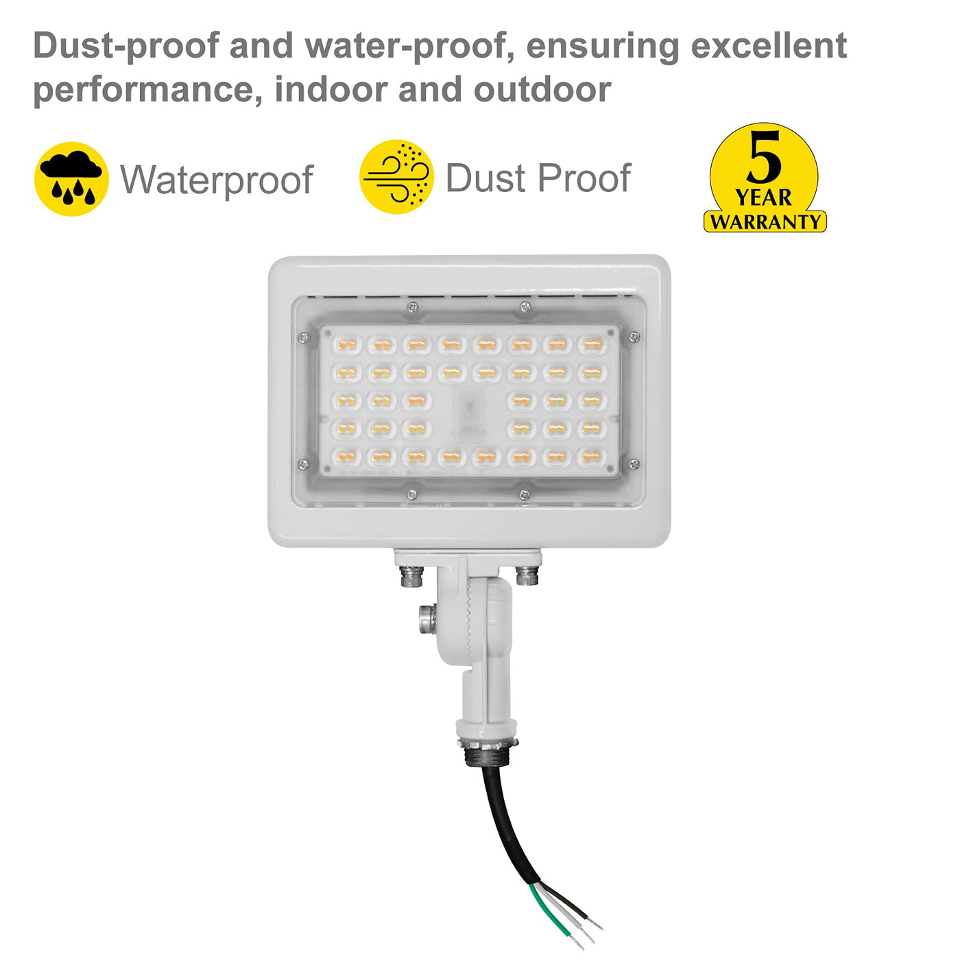 Presenting the NuWatt 15W 1/2" Inch Knuckle Mount White LED Flood Light, an exceptional rust resistant outdoor flood light fixture for homeowners and contractors. Brighten your backyard, workshop, porch, or parking lot with this corrosion free waterproof IP65 rated outdoor LED flood light. Engineered with a durable diecast aluminum, this ultra-bright outdoor flood light will last you an impressive 100,000 lifetime hours. Benefit from the super bright 2100LM emitted by our 15W outdoor floodlight fixtures. Plus, this weatherproof LED flood light enhances visibility and safety for any indoor or outdoor application, making it the ideal choice for an outdoor security light, flagpole light, garden flood light or as landscape lighting. Plus, take advantage of effortless control over brightness offered by our 0-10V dimmable flood light, enabling you to adjust the brightness using a standard dimmer. Plus, our outdoor floodlights also feature 3 CCT selectable color changing temperatures, between Warm White 3000K, Cool White 4000K, and Daylight 5000K Kelvin. Additionally, Nuwatt 5000K outdoor LED lights also come with an 1/2" in adjustable knuckle mount that swivels 180 degrees, allowing you to position your exterior flood lights where it's needed. And NuWatt Adjustable LED Flood Lights provide a wide voltage range of 120-277V, for effortless installation into residential or commercial buildings. So choose durability and reliability with Nuwatt's superior waterproof LED flood lights.