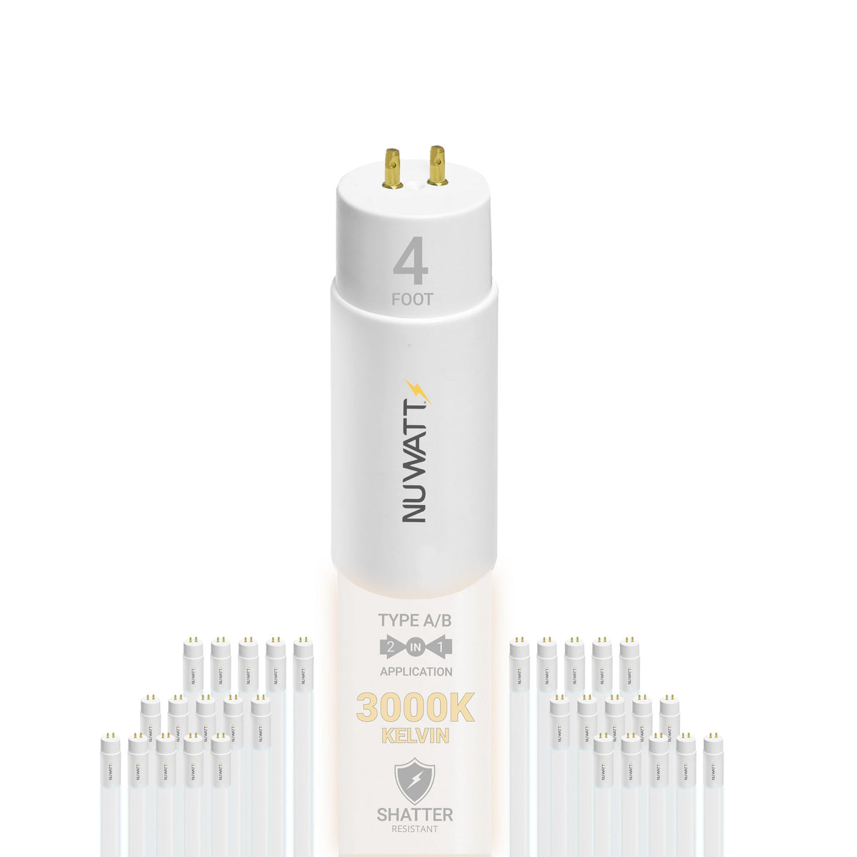 Nuwatt 30 Pack 4 Ft Led T8 Tube Light, T10 T12 Hybrid Type A+B, 3000K Warm White, 18W, High Brightness 2,200 Lumens, Plug & Play