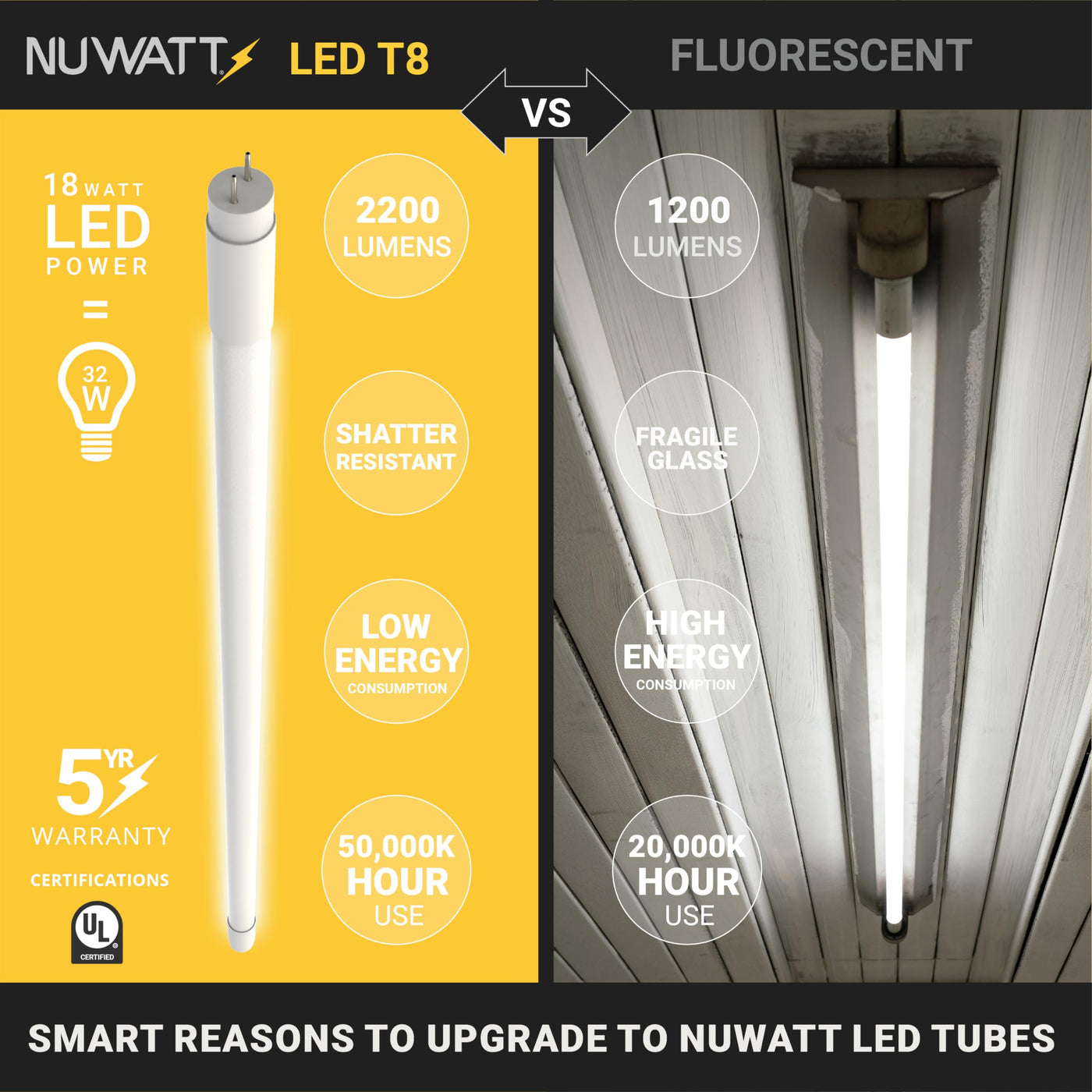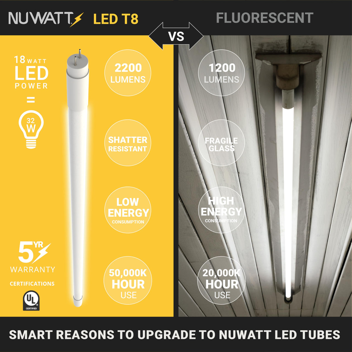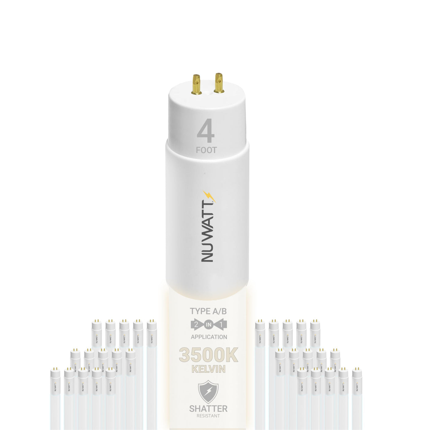 Elevate Your Lighting Experience With The Nuwatt 30-Pack T8 T10 T12 Hybrid Type A+B Light Tube. This 4Ft, 18W Tube Offers 3500K Neutral White Illumination, Setting A New Standard With A High Brightness Output Of 2,200 Lumens. These T8 Led Bulbs 4 Foot Ballast Bypass Tubes Serve Dual Purposes. They Function Both As A Plug & Play And As A Ballast Bypass Fluorescent Tube Replacement. Designed As Led Hybrid 4Ft Bulbs, They Can Be Installed Either Single Or Double-Ended, Providing You Ultimate Flexibility. With 3500K Neutral White Glow, These T8 Led Replacement Bulbs 4 Foot Are Perfect For A Variety Of Settings, Offering An Exceptional Led Replacement For Fluorescent Tubes. The 2,200 Lumens Output Ensures Your Spaces Are Uniformly Lit. These Versatile T-8 Led Ballast Bypass Tubes Can Be Installed Single Or Double-Ended, Offering A Hassle-Free Upgrade For T8, T10, Or T12 Fluorescent Tubes. At An Energy-Efficient 18W, These 4Ft Led Ballast Bypass Bulbs Are A Long-Lasting Alternative To Traditional Tubes, Boasting A Lifespan Of 50,000 Hours. Minimize Both Energy Costs And Maintenance Time. These Tubes Are Ul Listed, Meeting High Safety Standards. They'Re Also Damp-Resistant, Making Them An Ideal Garage Fluorescent Led Tube Replacements. A Shatter-Proof Protective Film Cover Makes It Safe To Use Anywhere! Ideal For Garage, Basements, Workshops, Laundry Room, Warehouse, Office, Technical Room, Workbench, Factory, Carport, Recreation Room, Bathroom, Living Room, Bedroom, Storage Rooms, Patio, Shop, Exterior Wall, Terrace, Kitchen Hall, Hallway, Balcony, Farm And So On!