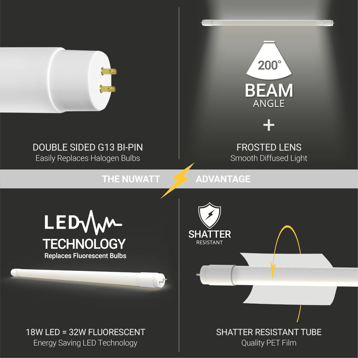 Q: Are these LED tube lights safe and durable?A: Yes, the NuWatt LED tube lights are engineered with a shatterproof design, featuring robust glass construction covered by a protective PET film. This enhances safety and durability, making them suitable for various environments.