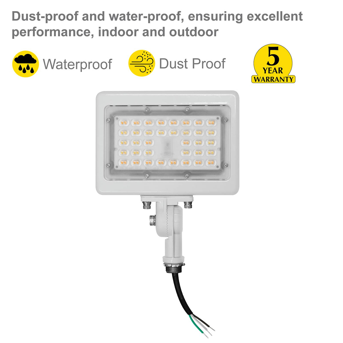 Presenting the NuWatt 30W Knuckle Mount White LED Flood Light, a remarkable corrosion free outdoor flood light meticulously designed for both homeowners and contractors. Illuminate your outdoor areas, whether it's for landscaping lights, gardens, patios, or exterior flood lights for the backyard. Elevate your outdoor lighting experience with this waterproof LED floodlight, with exceptional high brightness of 4200 lumens. Plus, our heavy duty floodlights have a 180-degree range of motion for easy installation on ceilings, floors, flagpoles, and walls. And with Nuwatt Exterior Flood Lights, you have control over the brightness when using a standard 0-10V dimmer. Also to go one step further, Nuwatt Weatherproof Flood Lights offer a 3CCT selectable color changing temperature switch. Choose from Warm White 3000K, Cool White 4000K, or Daylight 5000K. And you can trust our 5000K floodlights are IP65 water resistant rated, this means protection against dust, moisture, snow and unpredictable weather conditions. This makes our rust proof outdoor flood lights the best choice for all outdoor applications. Additionally our 1/2 inch knuckle mount LED floodlights offer flexibility with their wide voltage range of 120-277V, ensuring effortless integration into commercial or residential spaces. So opt for the best flood light on the market, and go with top-rated quality, and exceptional heavy duty materials by choosing NuWatt Ultra Bright Exterior Flood Lighting.