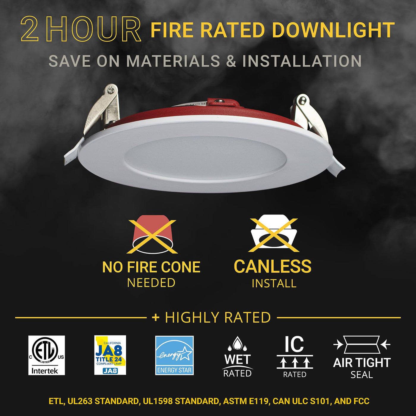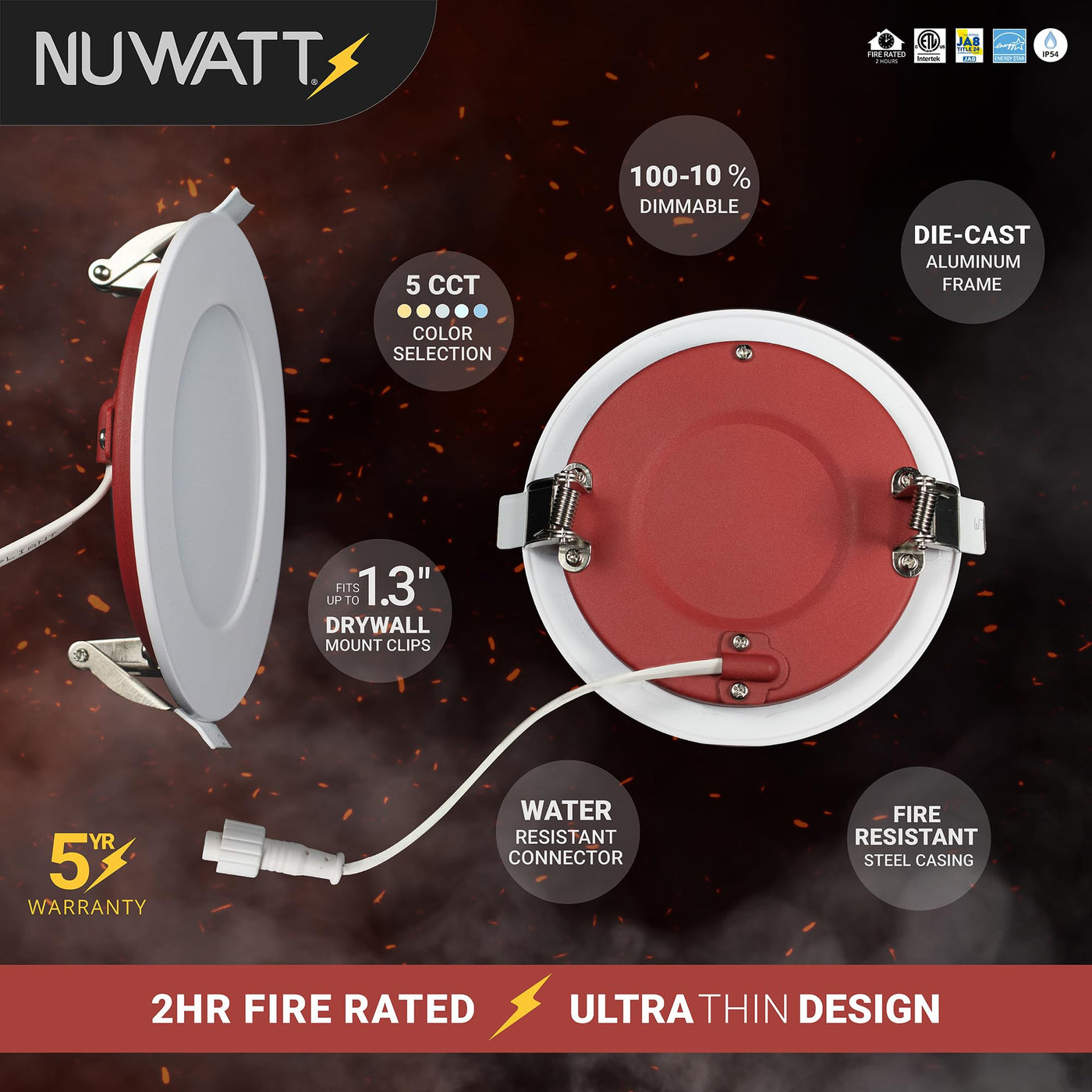 Introducing Nuwatt Fire Rated Ultra Thin Recessed Downlight, The Ultimate Lighting Solution Combining Style, Safety, And Simplicity. With Prestigious Ul263, Ul1598, Astm E119, & Can Ulc S101 Fire Resistance Certification And Ic Rated, This Downlight Ensures Peace Of Mind And Safe Installation. Seamlessly Integrated Into Your Ceiling, Our Canless Downlight Is Crafted With Fire-Resistant Materials, And Rigorously Tested To Meet Ul Standards For Extreme Temperatures. It Captivates Attention With Its Sleek, Modern Design That Effortlessly Blends With Any Decor, Adding Sophistication To Your Space. Installation Is A Breeze! Nuwatt'S Fire Rated Slim Wafer Light Offers Hassle Free, Canless Installation With Water Resistant Twist Connectors For Secure Electrical Connections. Its Ultra-Thin Design And User-Friendly Features Make The Process Quick And Easy. Enjoy Dimmability From 10 Percent To 100 Percent On A Triac Dimmer, And A High Color Rendering Index Of 90, Cri90 Plus, That Accurately Showcases Colors. Choose From Five Selectable Color Temperatures 2700K Soft White, 3000K Warm White, 3500K Neutral White, 4000K Cool White, And 5000K Daylight Using The External Metal Junction Box'S Color Selectable Switch. Experience The Perfect Blend Of Safety, Style, Simplicity, Dimmability, Color Accuracy, Cri 90 Plus, Water-Resistant Connectors, And Ic Rating With Nuwatt'S Fire Rated Ultra-Slim Led Recessed Lighting. Upgrade Your Lighting Game With Confidence, Trust Its Superior Safety, Stylish Design, And Energy Efficiency, Energy Star Certified. Let'S Light The Way To A Brighter Future!