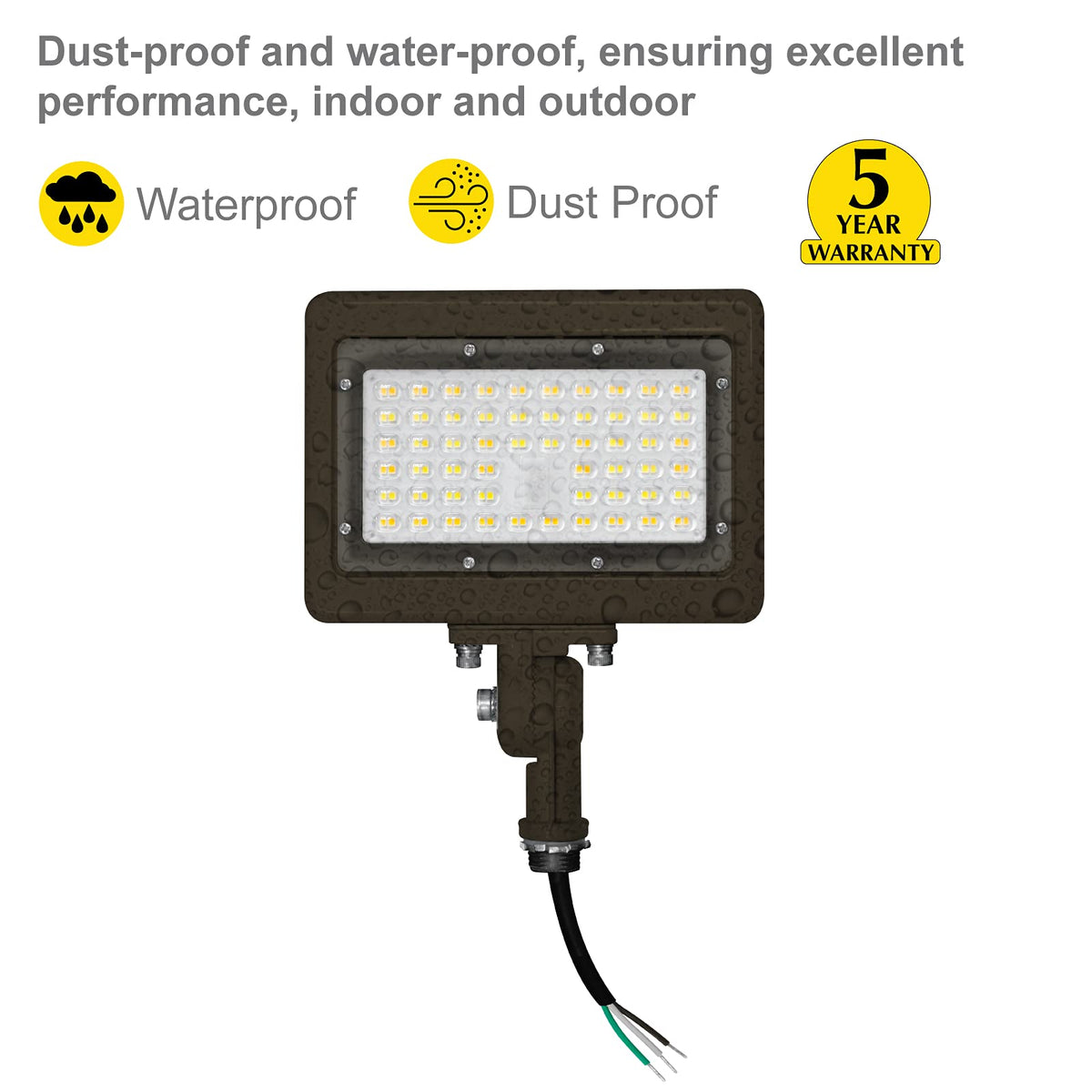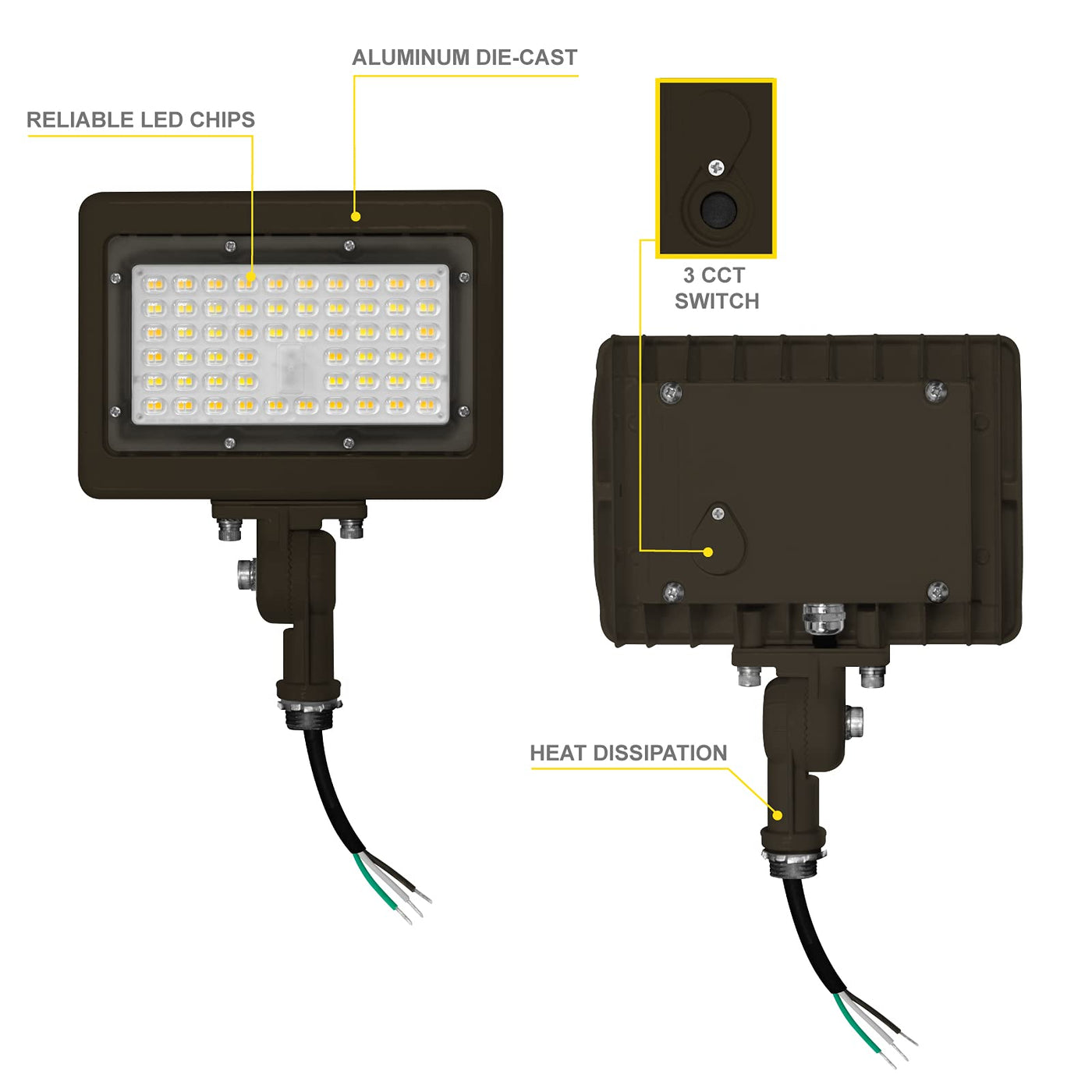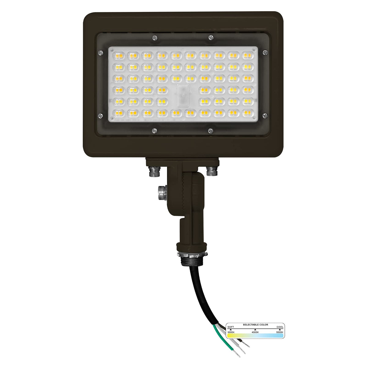 Introducing the NuWatt 50W Heavy Duty Bronze LED Flood Light with Knuckle Mount Base. This commercial grade waterproof outdoor floodlight is designed for both homeowners and professional contractors. Illuminate your outdoor spaces, whether it's for exterior home lighting, gardens, patios, or backyard flood lighting. This water-resistant LED flood light proudly holds an IP65 rating, ensuring great performance in wet outdoor conditions. Plus, our outdoor LED flood lighting comes with an adjustable 1/2” knuckle mount base, offering a 180-degree range of motion.This flexibility allows you to harness the super bright 7050 lumens emitted by this 5000K outdoor floodlight. And Nuwatt ultra-bright flood lights are 0-10V dimmable. Take control over the intensity of your LED outdoor flood light when using a standard dimmer switch. Additionally, NuWatt Corrosion Free LED Flood Lights go the extra mile with a 3CCT selectable color changing temperature switch, choose from Warm White 3000K, Cool White 4000K, or Daylight 5000K. And with NuWatt 50W Bronze LED Floodlights extensive voltage range of 120-277V, they ensure seamless integration into commercial and residential building electrical systems. Opt for dependability and unmatched customer support by selecting this color selectable weatherproof LED flood light by NuWatt.