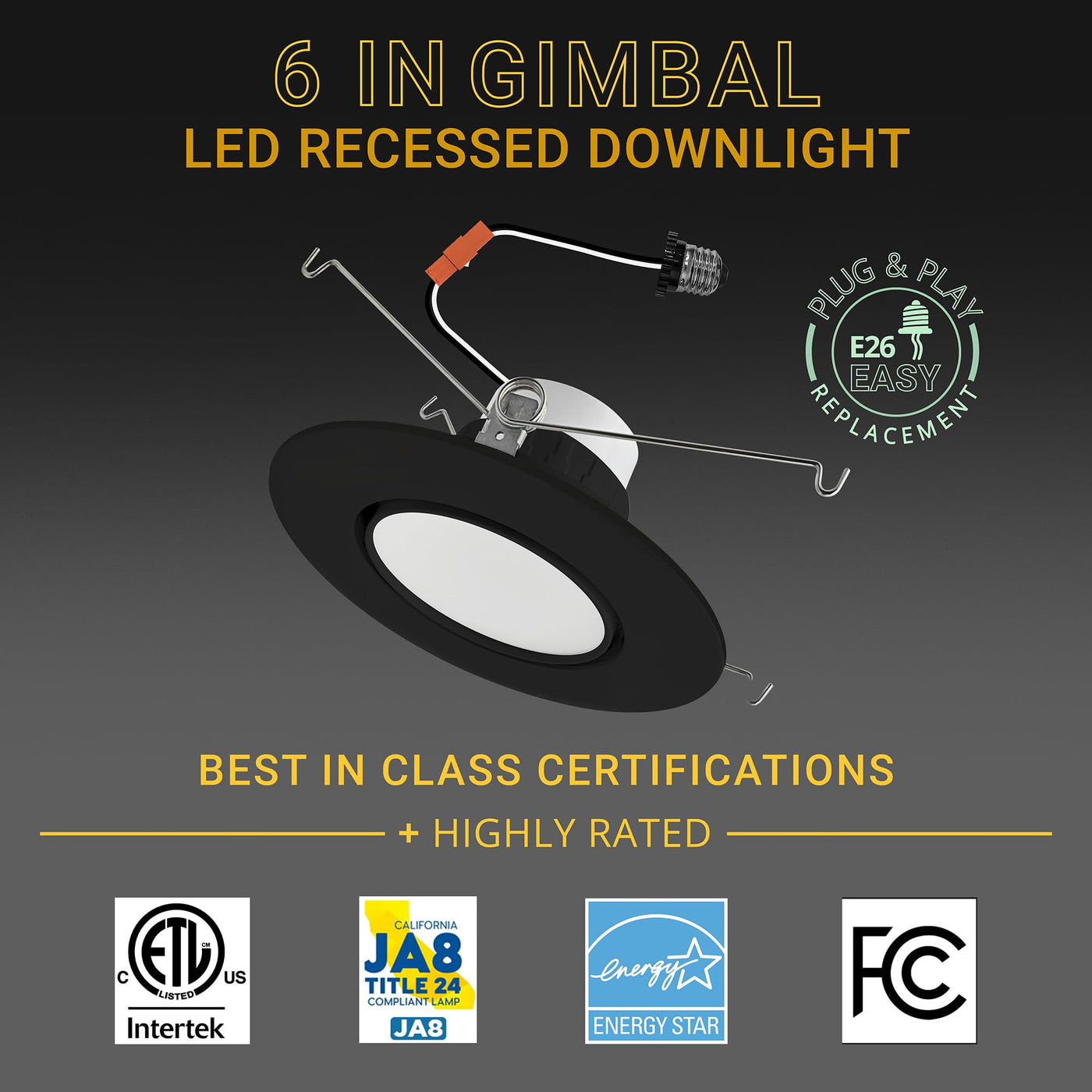 Introducing the NuWatt 6 inch Black Trim Retrofit Gimbal Recessed Downlight: Your Ultimate Adjustable LED Recessed Lighting Solution. Whether you're a homeowner looking to upgrade your lighting or a contractor seeking a versatile and efficient option for your projects, this cutting edge downlight offers unrivaled performance and an array of convenient features that will enhance the ambiance and functionality of any room. The NuWatt 6 inch Retrofit LED Eyeball Recessed Light features Selectable 5CCT capabilities, which allow you to effortlessly customize the color temperature of your lighting to suit your mood and preferences. Choose from five selectable color temperatures 2700K soft white, 3000K warm white, 3500K neutral white, 4000K cool white, and 5000K daylight using the Selectable Switch. Equipped with a powerful 16W driver, the NuWatt 6 inch Retrofit LED Gimbal Recessed Light delivers an impressive 1200 lumens of high brightness and energy efficient illumination. With its E26 base, installation is a breeze Simply replace your existing lighting fixtures with the NuWatt Retrofit Gimbal Downlight, and instantly light up your space. NuWatt 6 inch Retrofit Gimbal Downlight ensures safety and efficiency. With certifications from ETL, Energy Star JA-8, and IC rated housing, it surpasses industry standards, providing peace of mind for a reliable, efficient, and safe lighting solution. The NuWatt 6 inch Retrofit Gimbal offers adjustable brightness (10%-100%), allowing you to create the ideal lighting for any occasion, from cozy ambience to bright task lighting. Enjoy complete control over your lighting environment for the perfect atmosphere. Transform your space with the NuWatt 6in Adjustable Downlight and unlock a world of possibilities. Order yours today and Let's light the way to a brighter future!