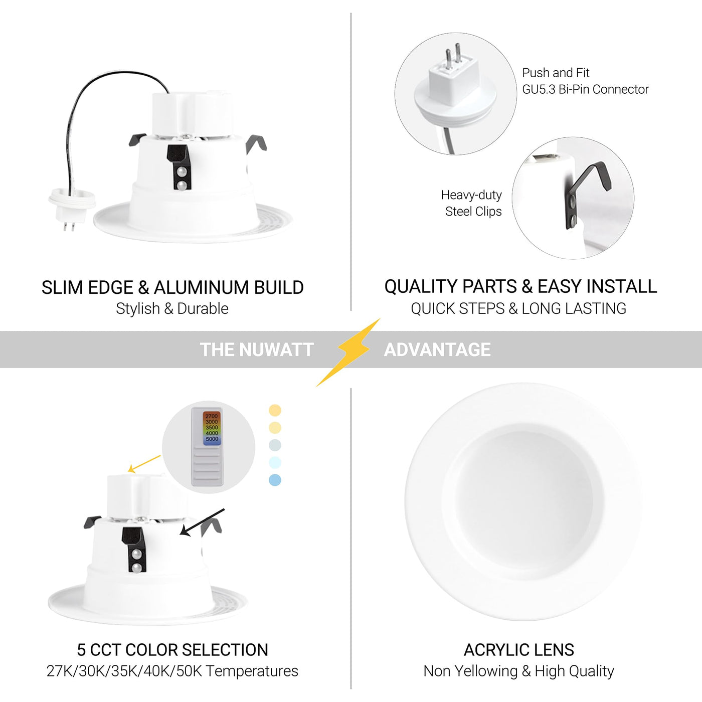 Nuwatt 6 Pack 4 Inch Mr16 Retrofit Led Recessed Lighting, 5Cct Selectable 2700K/3000K/3500K/4000K/5000K, 10W 600Lm, Dimmable Low