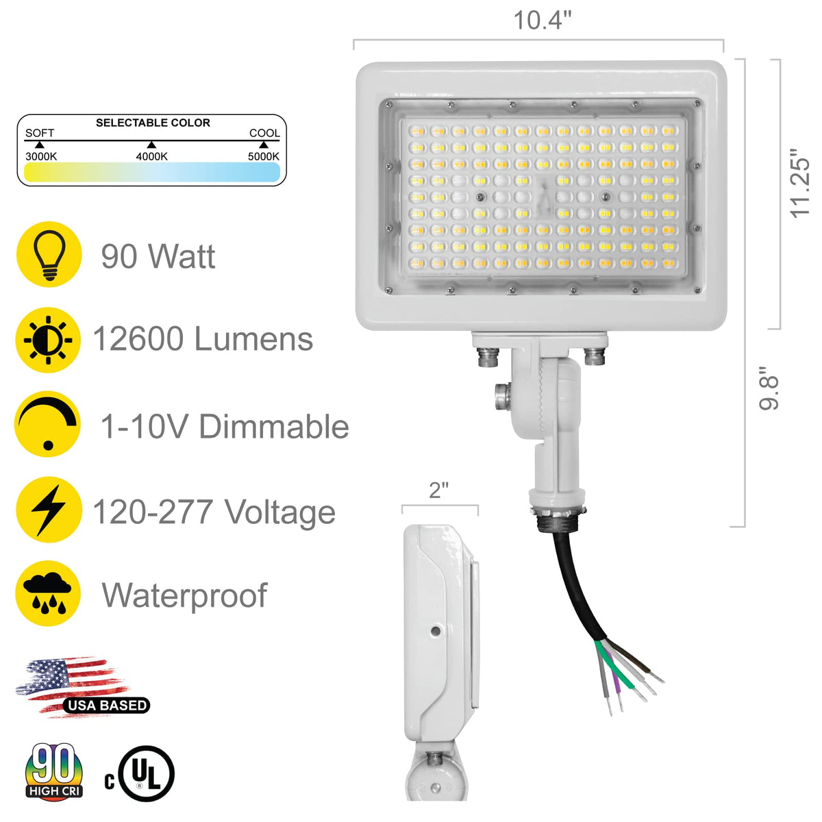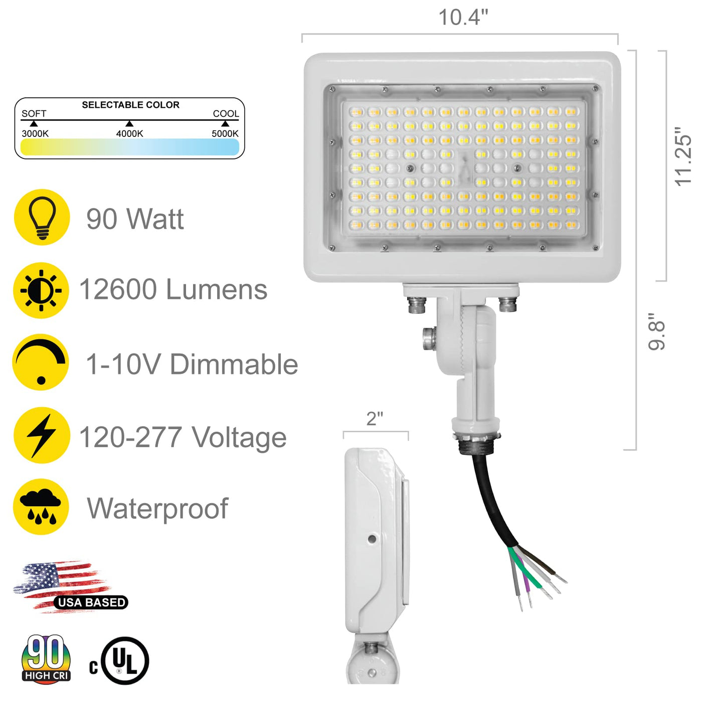 Nuwatt 90W Led Flood Light, 3Cct 3000K/4000K/5000K Selectable, Ip65 Waterproof Lighting, Adjustable Knuckle Mount, 12600Lm, 0-10V Dimmable, 120-277V, Outdoor Security Floodlight For Yard, White, Ul