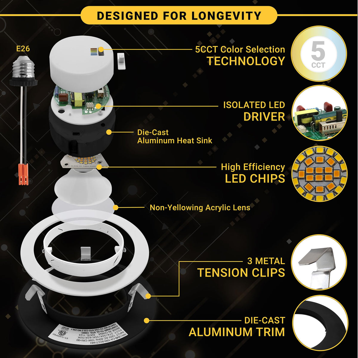 Introducing the NuWatt 4 Inch Black Trim Retrofit Gimbal Recessed Downlight: Your Ultimate Adjustable LED Recessed Lighting Solution. Whether you're a homeowner looking to upgrade your lighting or a contractor seeking a versatile and efficient option for your projects, this cutting edge downlight offers unrivaled performance and an array of convenient features that will enhance the ambiance and functionality of any room. The NuWatt 4 inch Retrofit LED Eyeball Recessed Light features Selectable 5CCT capabilities, which allow you to effortlessly customize the color temperature of your lighting to suit your mood and preferences. Choose from five selectable color temperatures 2700K soft white, 3000K warm white, 3500K neutral white, 4000K cool white, and 5000K daylight using the Selectable Switch. Equipped with a powerful 10W driver, the NuWatt 4 inch Retrofit LED Gimbal Recessed Light delivers an impressive 750 lumens of high brightness and energy efficient illumination. With its E24 base, installation is a breeze Simply replace your existing lighting fixtures with the NuWatt Retrofit Gimbal Downlight, and instantly light up your space. NuWatt 4 inch Retrofit Gimbal Downlight ensures safety and efficiency. With certifications from ETL, Energy Star JA-8, and IC rated housing, it surpasses industry standards, providing peace of mind for a reliable, efficient, and safe lighting solution. The NuWatt 4 inch Retrofit Gimbal offers adjustable brightness (10%-100%), allowing you to create the ideal lighting for any occasion, from cozy ambience to bright task lighting. Enjoy complete control over your lighting environment for the perfect atmosphere. Transform your space with the NuWatt 4in Adjustable Downlight and unlock a world of possibilities. Order yours today and Let's light the way to a brighter future!