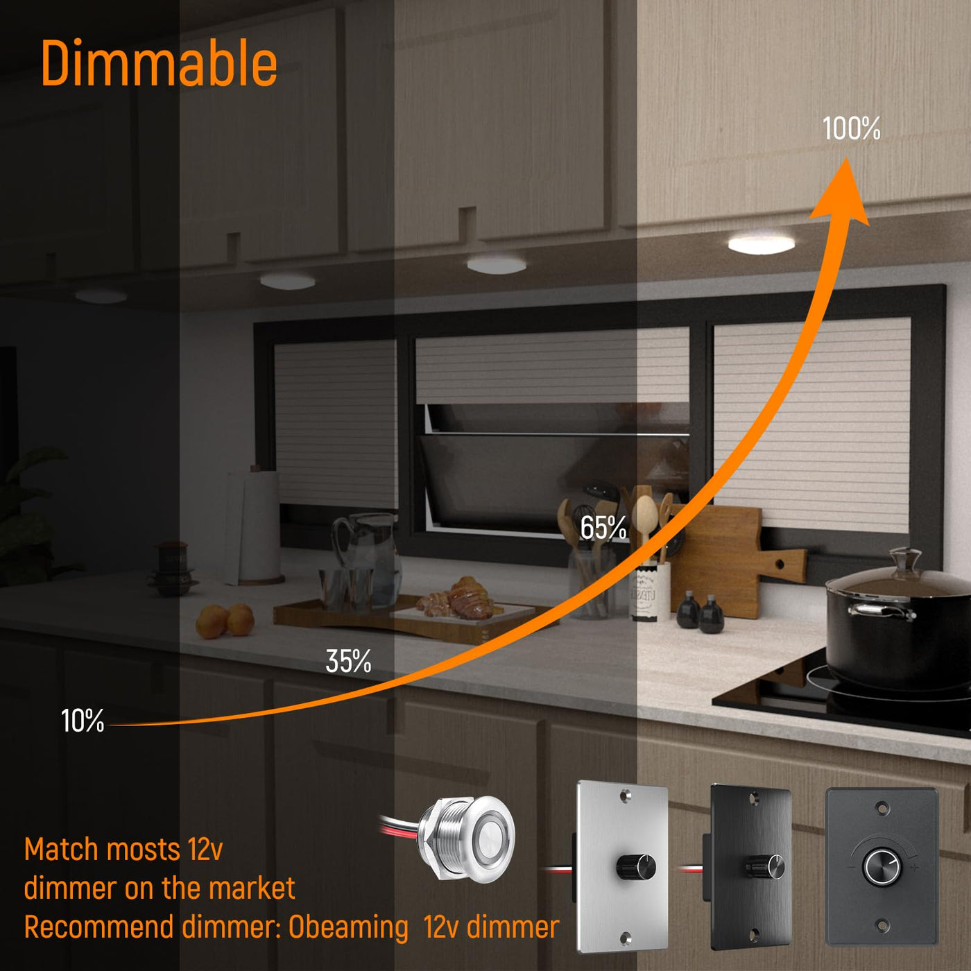 Q: Are these lights compatible with dimmers?A: Yes, Obeaming LED Puck Lights are dimmable and work effectively with Obeaming 12V dimmers. For optimal performance, you can choose from various dimmer options sold separately, such as stainless press dimmers or knob dimmers.