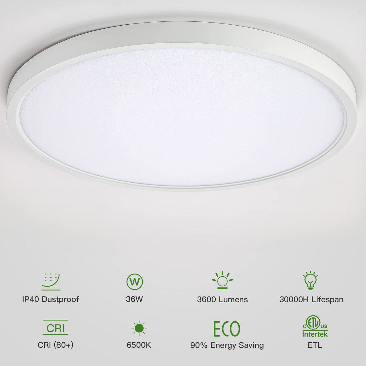 This ceiling light features a durable construction with a well-made frosted plastic cover and advanced LED technology. With a low profile of just 0.94 inches, it seamlessly integrates into any decor while offering exceptional brightness. The fixture provides a luminous output of 3600 lumens at only 36 watts, significantly reducing energy consumption compared to traditional lighting options.
