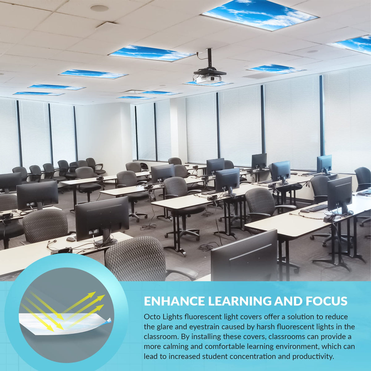 Constructed from well-made backlit film, the Octo Lights feature a stunning cloud design that brings a touch of nature indoors. These covers are lightweight and flexible, making installation straightforward and hassle-free. Simply place the cover inside any standard 2x4 feet fluorescent light fixture to instantly improve focus and reduce headaches and eye strain. The Octo Lights are particularly beneficial in special needs environments and for individuals with sensory sensitivities, including students with Autism or ADHD.