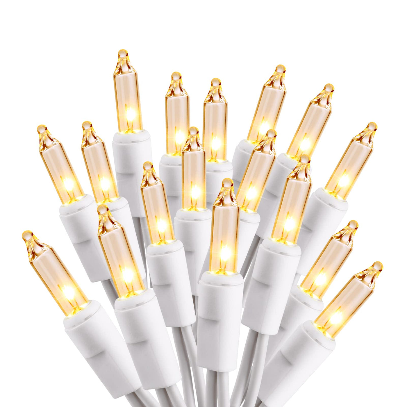 Features: 100 count warm white mini incandescent lights, create a warm and dreamy atmosphere for your home, holiday etc. Beautiful warm white glow, ideal for use on many holidays such as: Easter, Halloween, Thanksgiving, Christmas! Clear white wire string lights, perfect for your wedding, birthday, party decorations. 100% UL certified lights string, safe to use. Easy end-to-end connection, up to 5 sets (500 lights) IP44 waterproof, perfect for indoor and outdoor use. Comes with extra replacement bulb and fuse. Specifications: Total Length: 21.63ft Lighted Length: 19.8ft Plug Lead Length: 1.5ft Tail plug Lead Length: 0.33ft Bulb Space: 0.2ft Light Color: Warm White Wire Color: White Wire Bulb Type: Incandescent Bulbs Bulb Quantity: 100 Count Input Voltage: 120V Waterproof Class: IP44 Package Included: 1 x 100 Count Incandescent Christmas Lights 2 x Extra Bulbs 2 x Extra Fuses