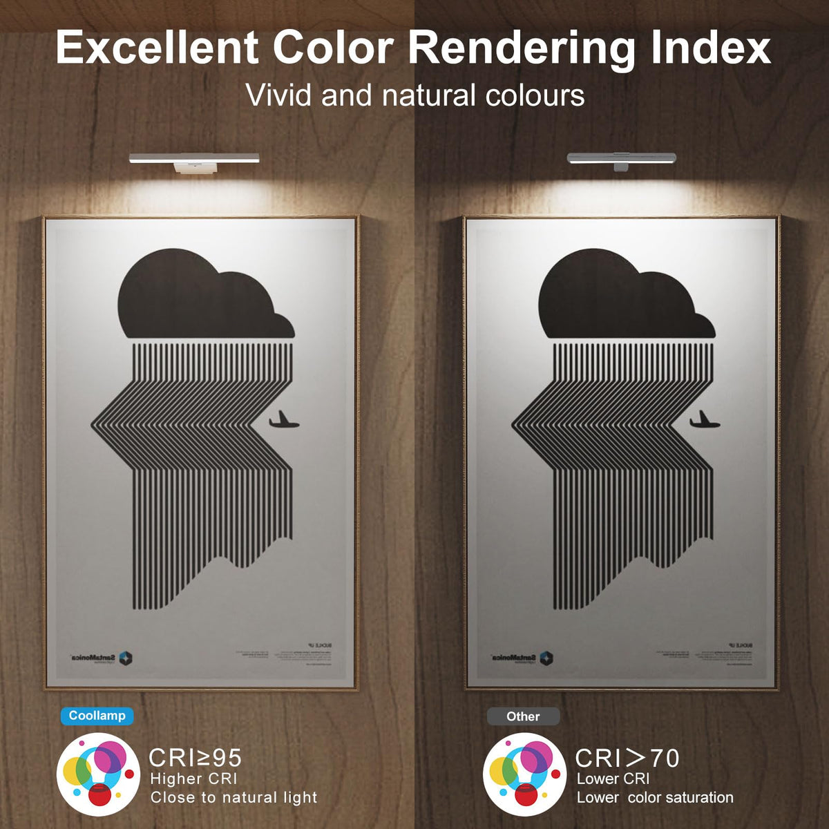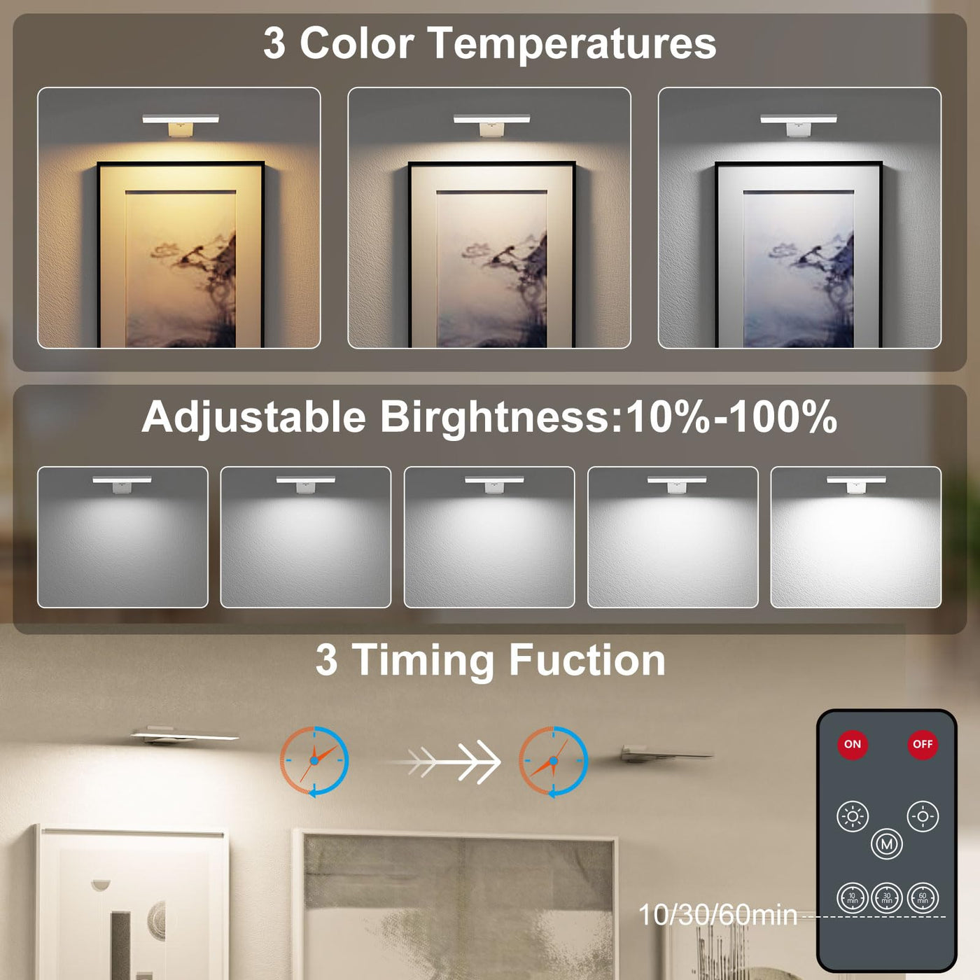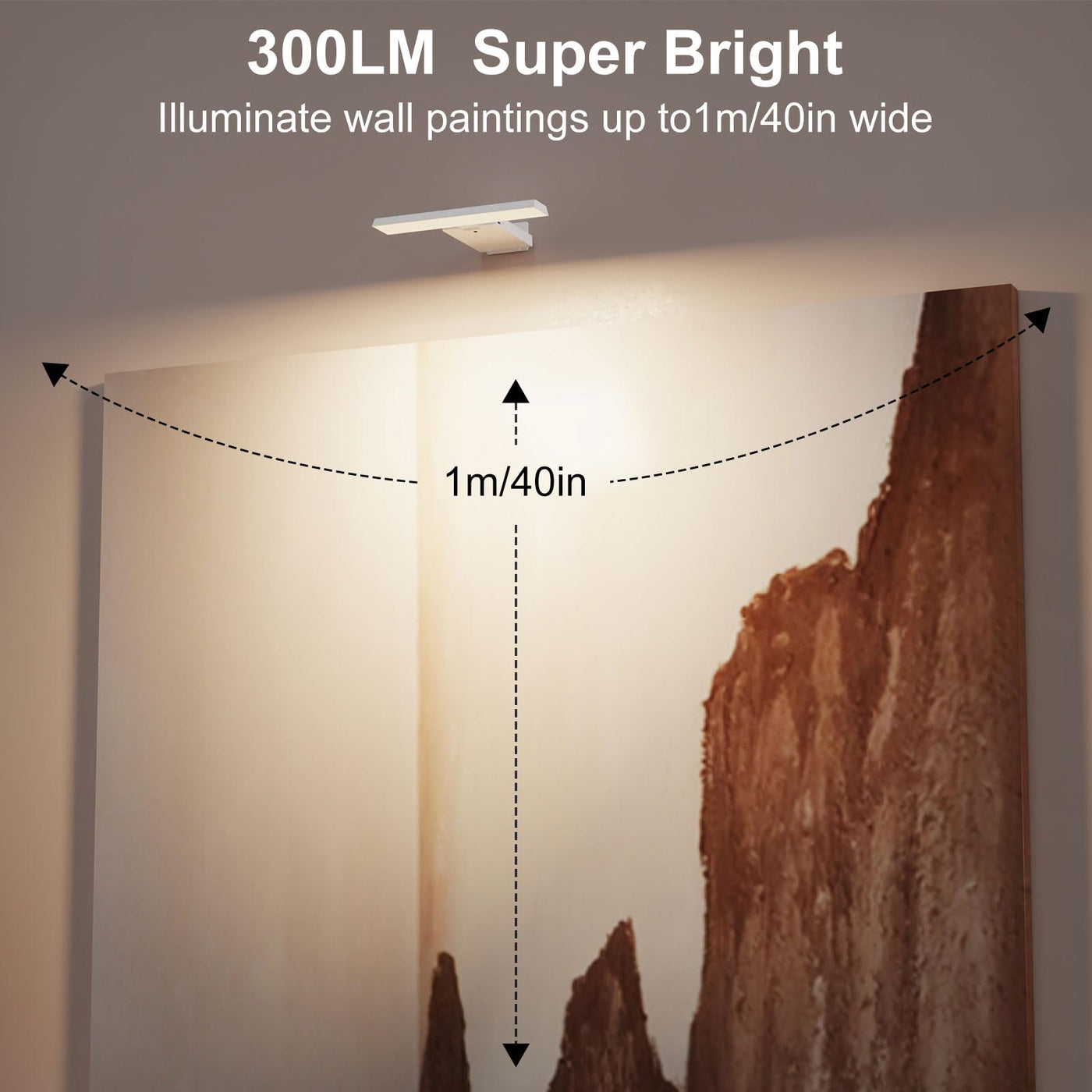 This picture light features 48 high-quality LED beads. With a Color Rendering Index (CRI) = 95 ,The lights for wall offers three color temperatures: 3000k,4500Kand 6000K, as well as five levels of adjustable brightness,and 300 lumens, it is super bright enough to illuminate pictures, statuary, artwork, and paintings.