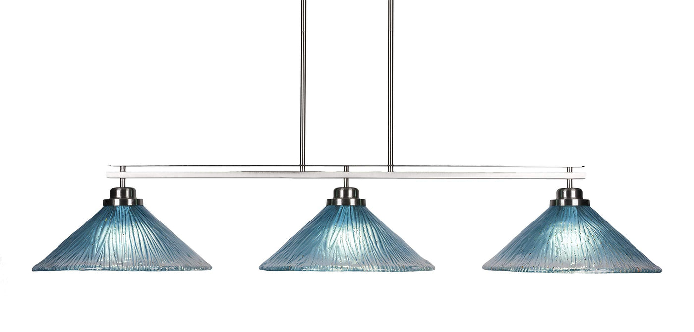 Q: What type of shade material is used in this light fixture?A: The Odyssey 3 Light Island features shades made of teal crystal glass, providing a stylish and elegant touch to your lighting design.