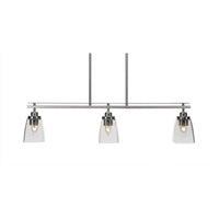 Q: What is the finish of the Odyssey 3 Light Island?A: The Odyssey 3 Light Island features a brushed nickel finish, paired with clear bubble glass for an elegant look.