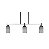 Q: What style of decor does the Odyssey 3 Light Island complement?A: The matte black finish and gray matrix glass of the Odyssey 3 Light Island make it a versatile fixture that complements various decor styles, including industrial, modern, and contemporary aesthetics.