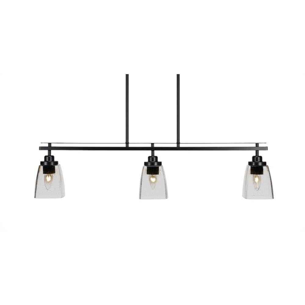Q: What makes the Odyssey 3 Light Island a good choice for my home decor?A: The Odyssey 3 Light Island features a stylish matte black finish and clear bubble glass that add a modern touch to your home decor. Its versatile design complements various interior styles, making it a perfect choice for enhancing ambiance in dining and kitchen areas.