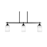 Q: What is the finish of the Odyssey 3 Light Island, and how does it complement decor?A: The Odyssey 3 Light Island features a sleek matte black finish that beautifully complements modern and contemporary decor styles, while the white muslin glass adds a soft, diffused light.
