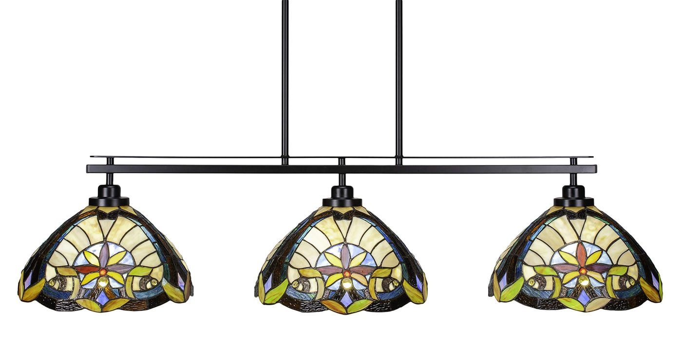 2636-MB-9369 Odyssey 3 Island Light Shown In Matte Black Finish With 12" Earth Star Art Glass. Rated for: Dry location. Light Bulb Data: 3 Medium 150 watt. Bulb included: No.