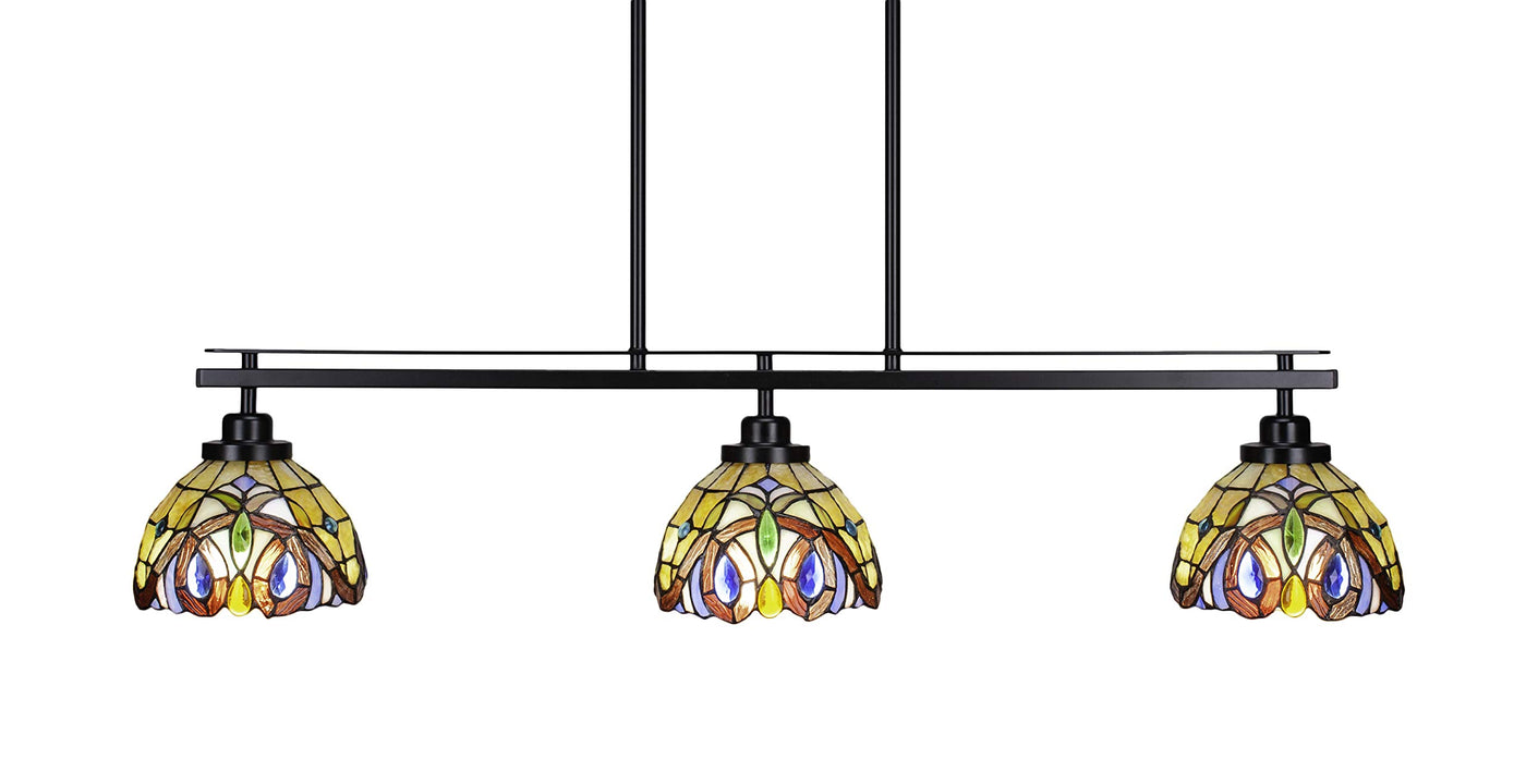 2636-MB-9445 Odyssey 3 Island Light Shown In Matte Black Finish With 7" Lynx Art Glass. Rated for: Dry location. Light Bulb Data: 3 Medium 150 watt. Bulb included: No.