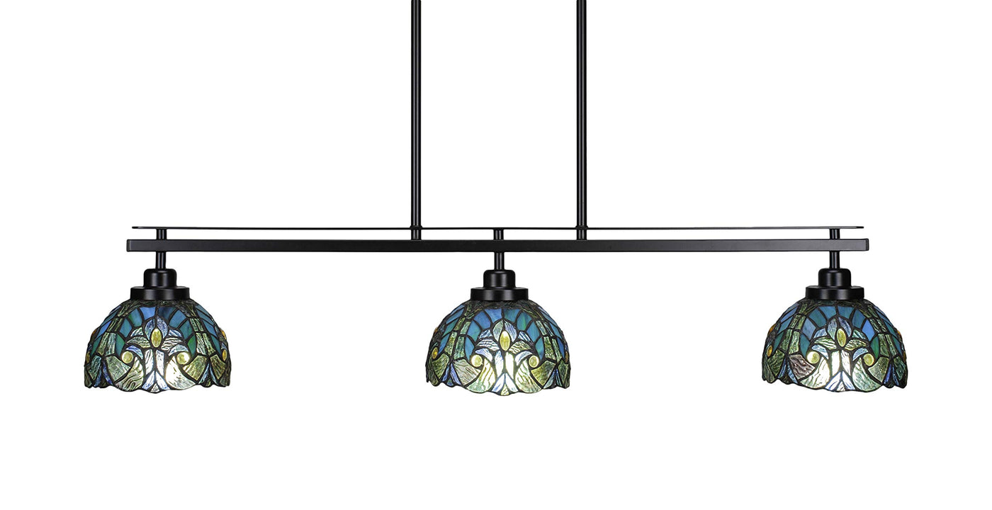 2636-MB-9925 Odyssey 3 Island Light Shown In Matte Black Finish With 7" Turquoise Cypress Art Glass. Rated for: Dry location. Light Bulb Data: 3 Medium 150 watt. Bulb included: No.
